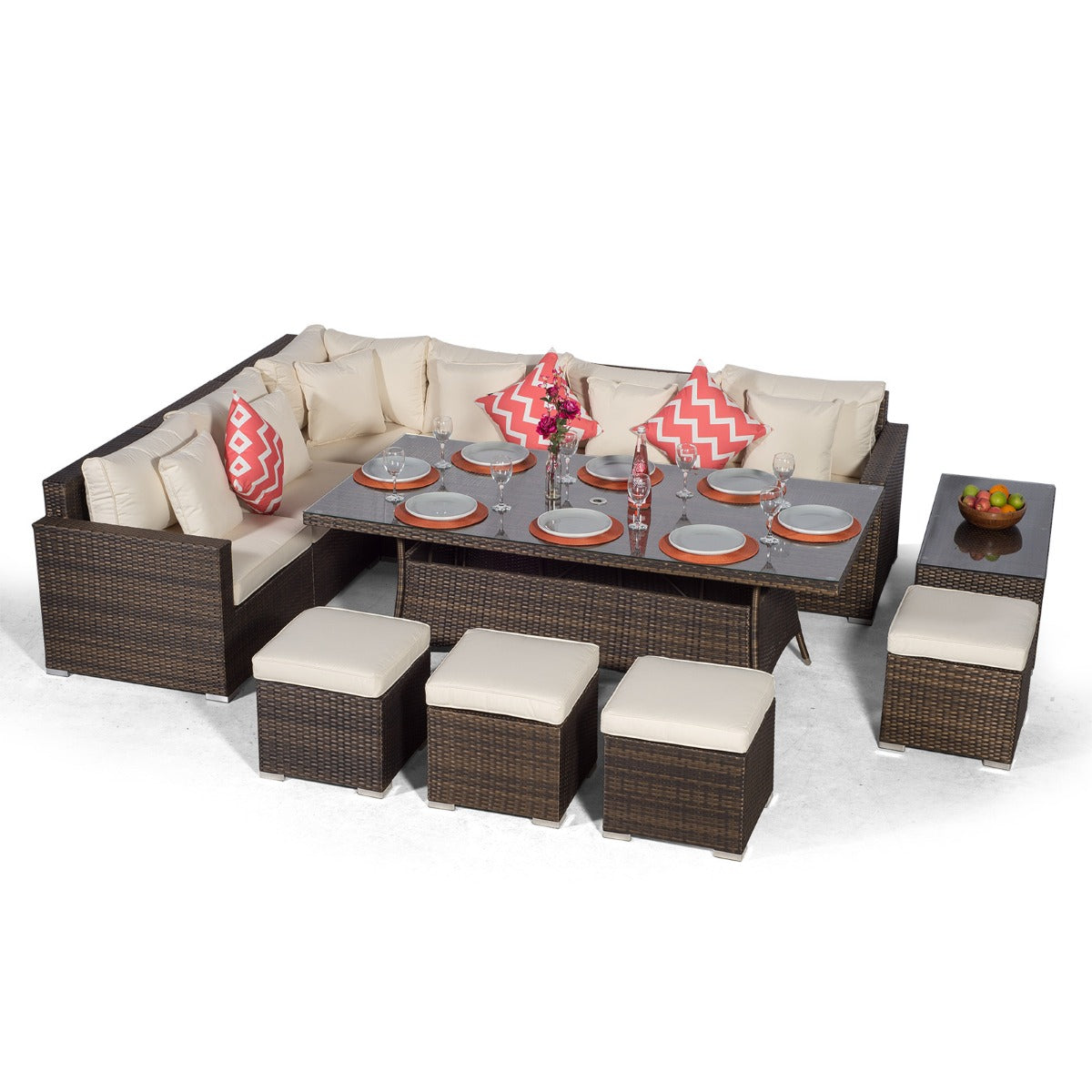 HAVANA - 10 SEAT RATTAN CORNER SOFA DINING SET WITH STOOLS & COFFEE TABLE - BROWN