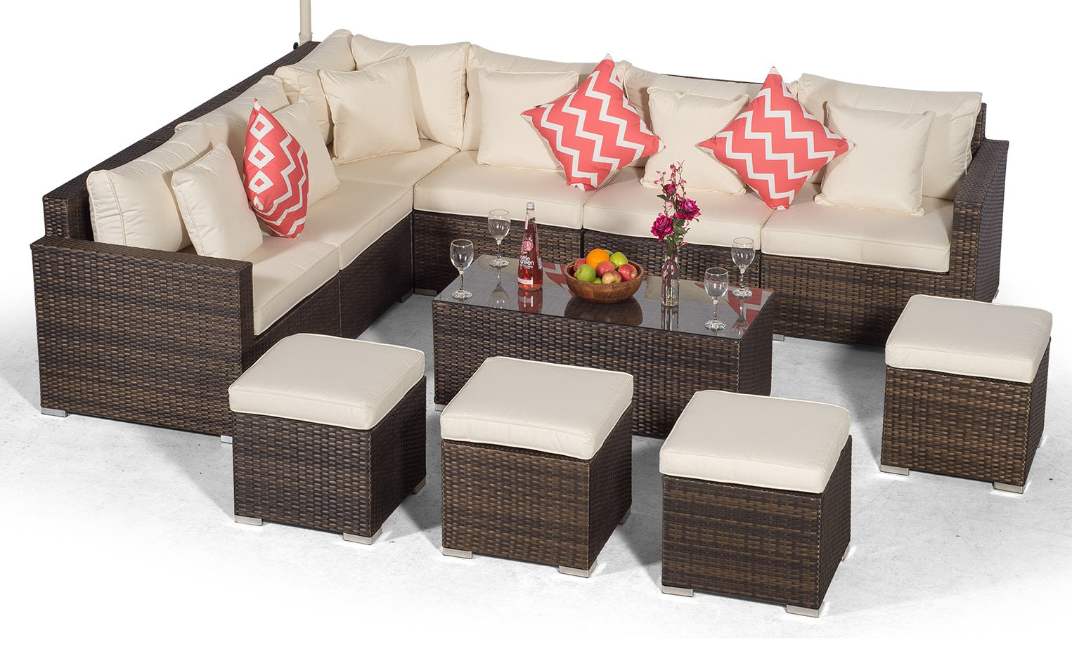 One of the versatile features of this set is that the corner sofa and dining table can be used at the same time independently of each other. The dining table can function separately as a dining set using the stools and parasol included, whilst the sofa set can function independently using the coffee table, providing the ideal setting for casual drinks and snacks.