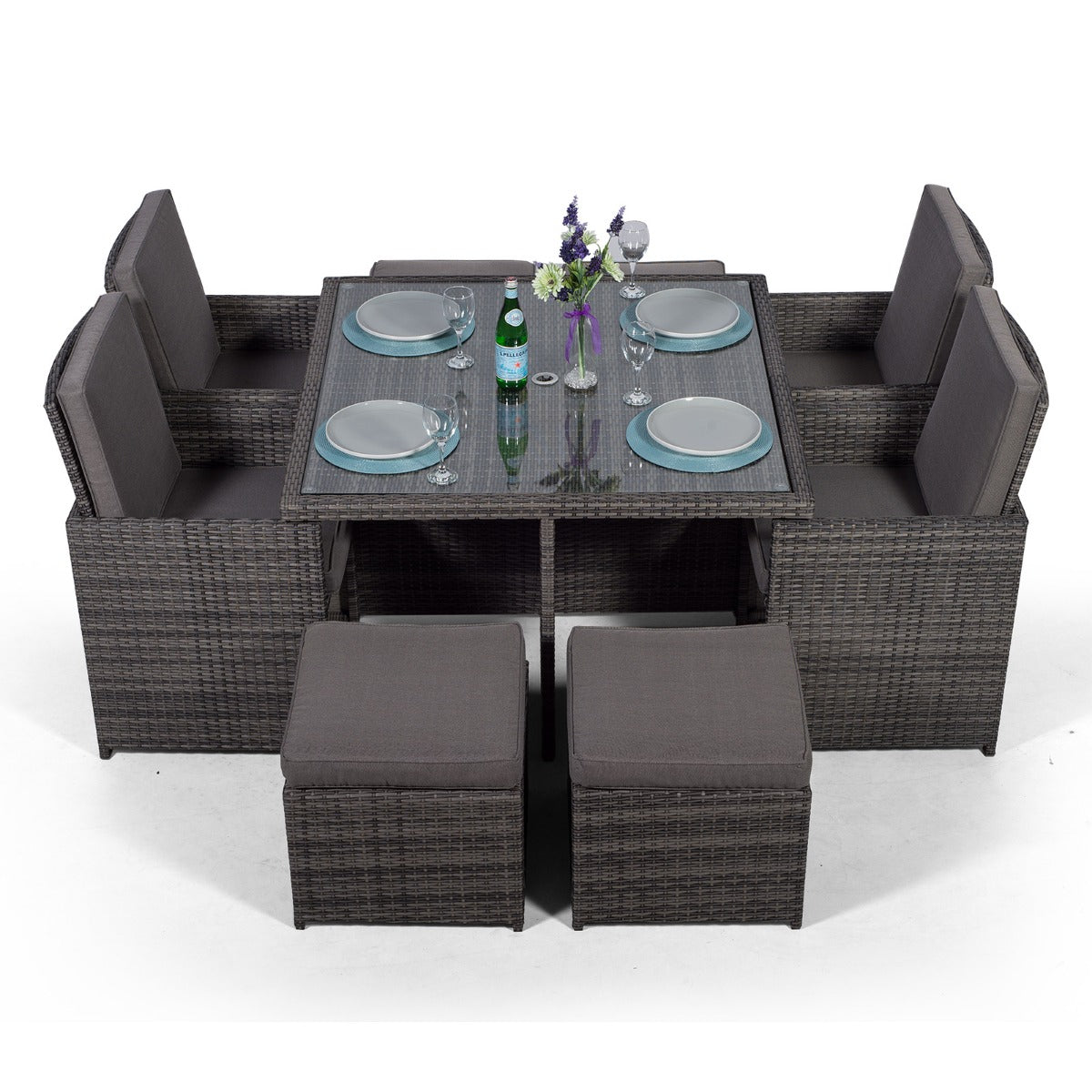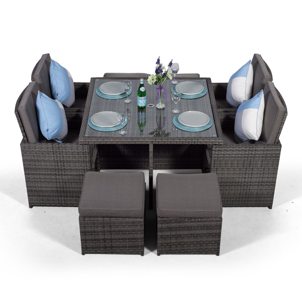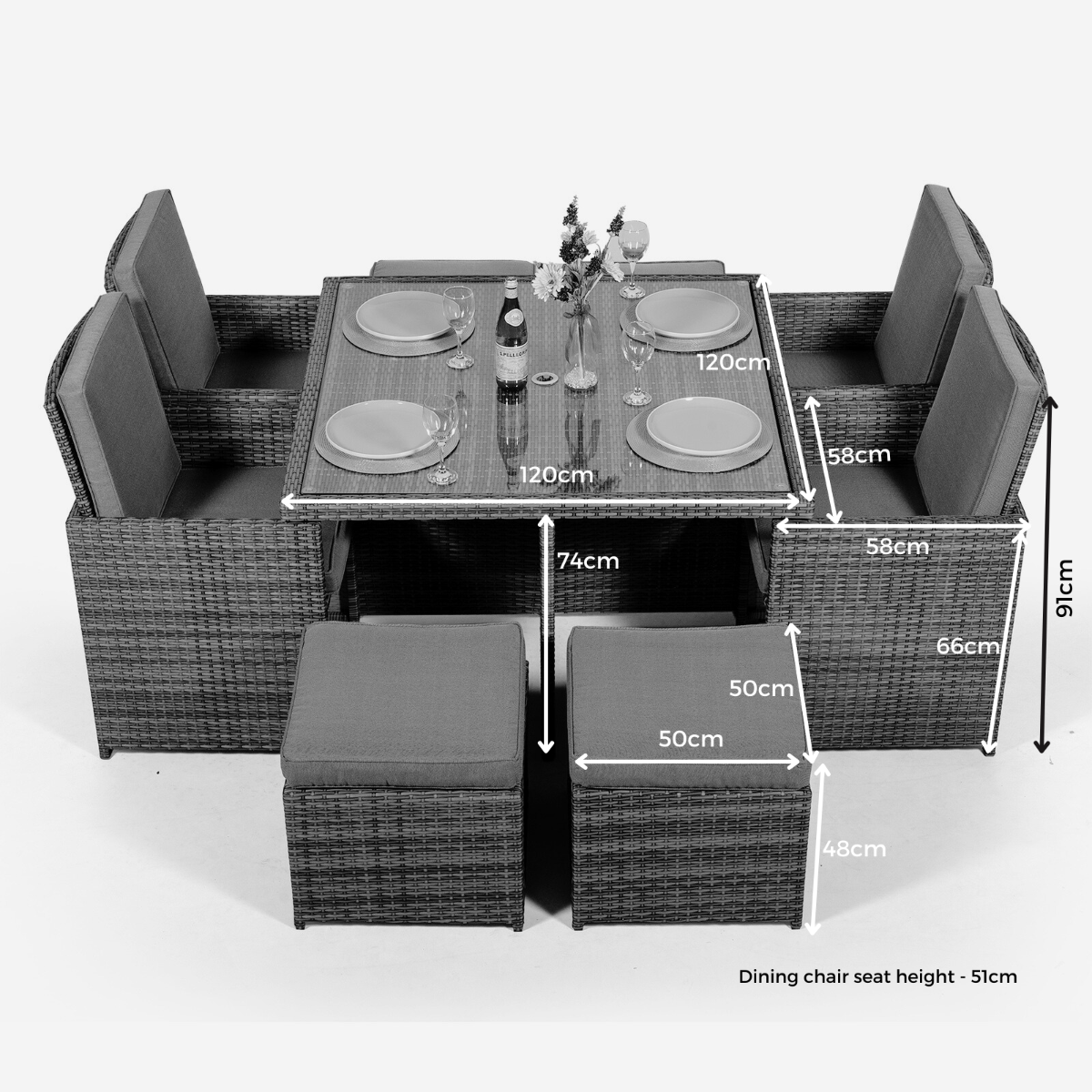 Compact & stylish, the Giardino Cube rattan dining set lets you enjoy a full scale dining experience without sacrificing style or space. Featuring a square 120 x 120cm rattan dining table, 4 rattan dining chairs, 4 stools, and a 2x2m parasol, this compact outdoor dining set can seat up to 8 people and neatly stores away within the parameters of the dining table.