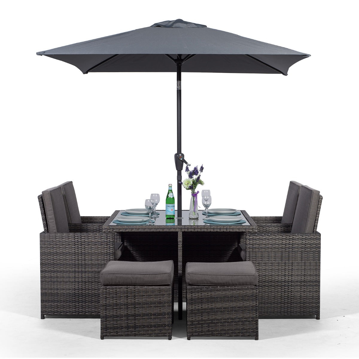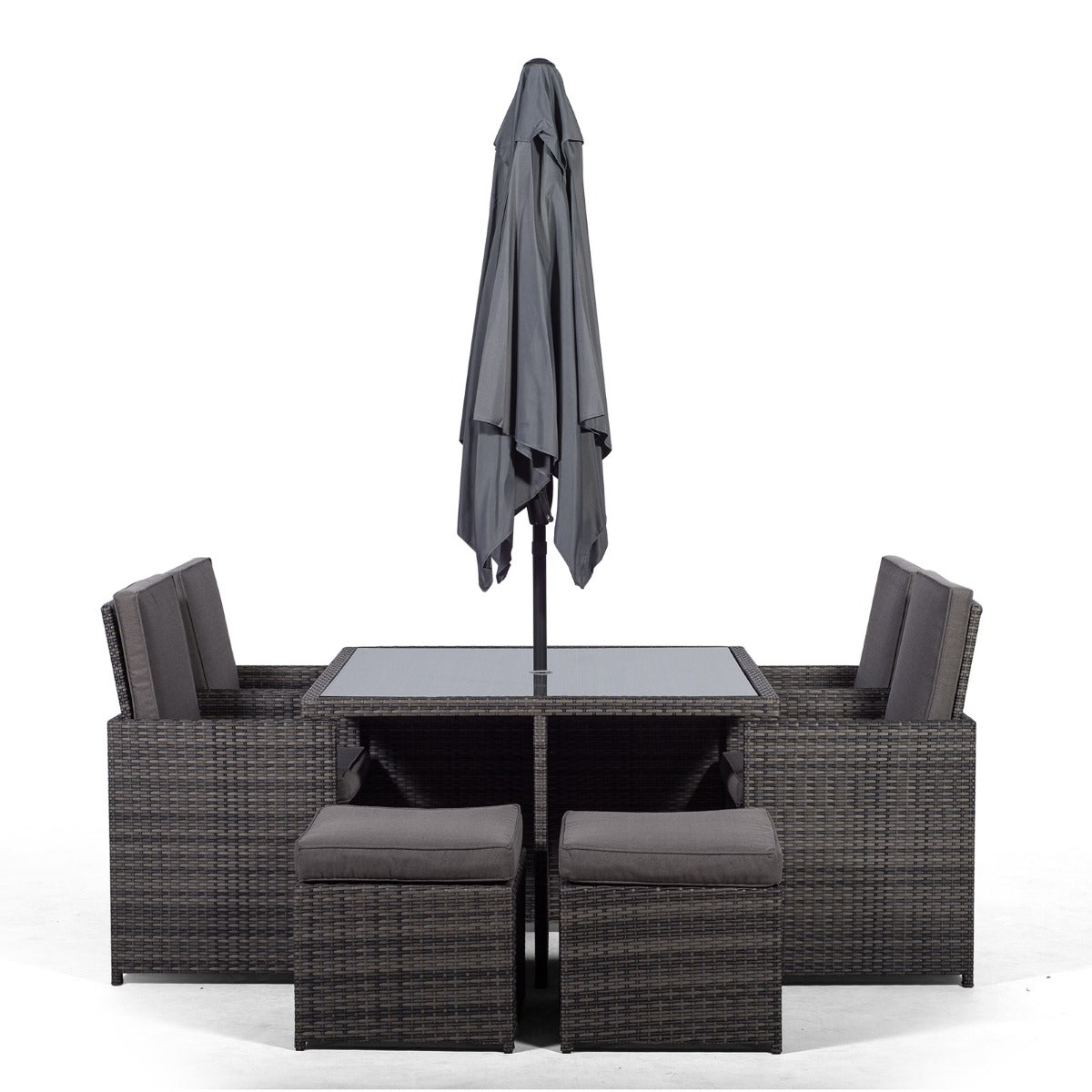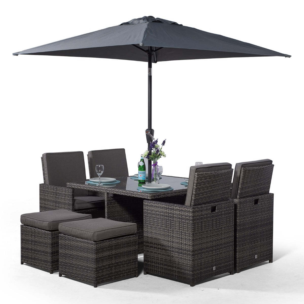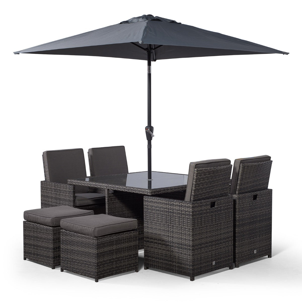 Giardino Rattan 4 Seater Cube Dining Table & Chairs Set with 4 Stools & Parasol - Grey