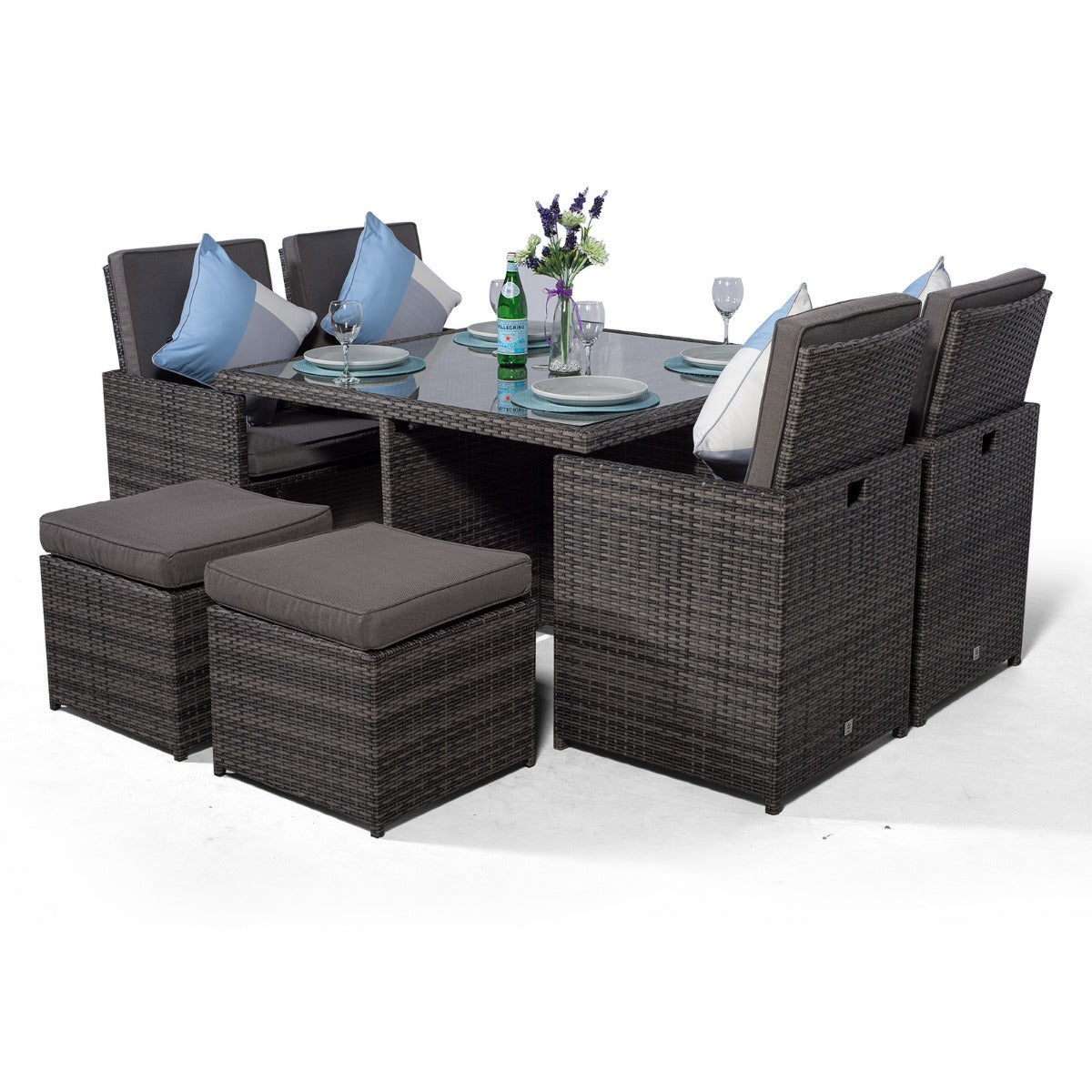 Available in a ultra stylish mixed grey rattan weave, this stylish Cube dining set has an ultra modern look with straight clean lines and minimalist features, making this rattan cube garden table set a focal point for your outdoor space.