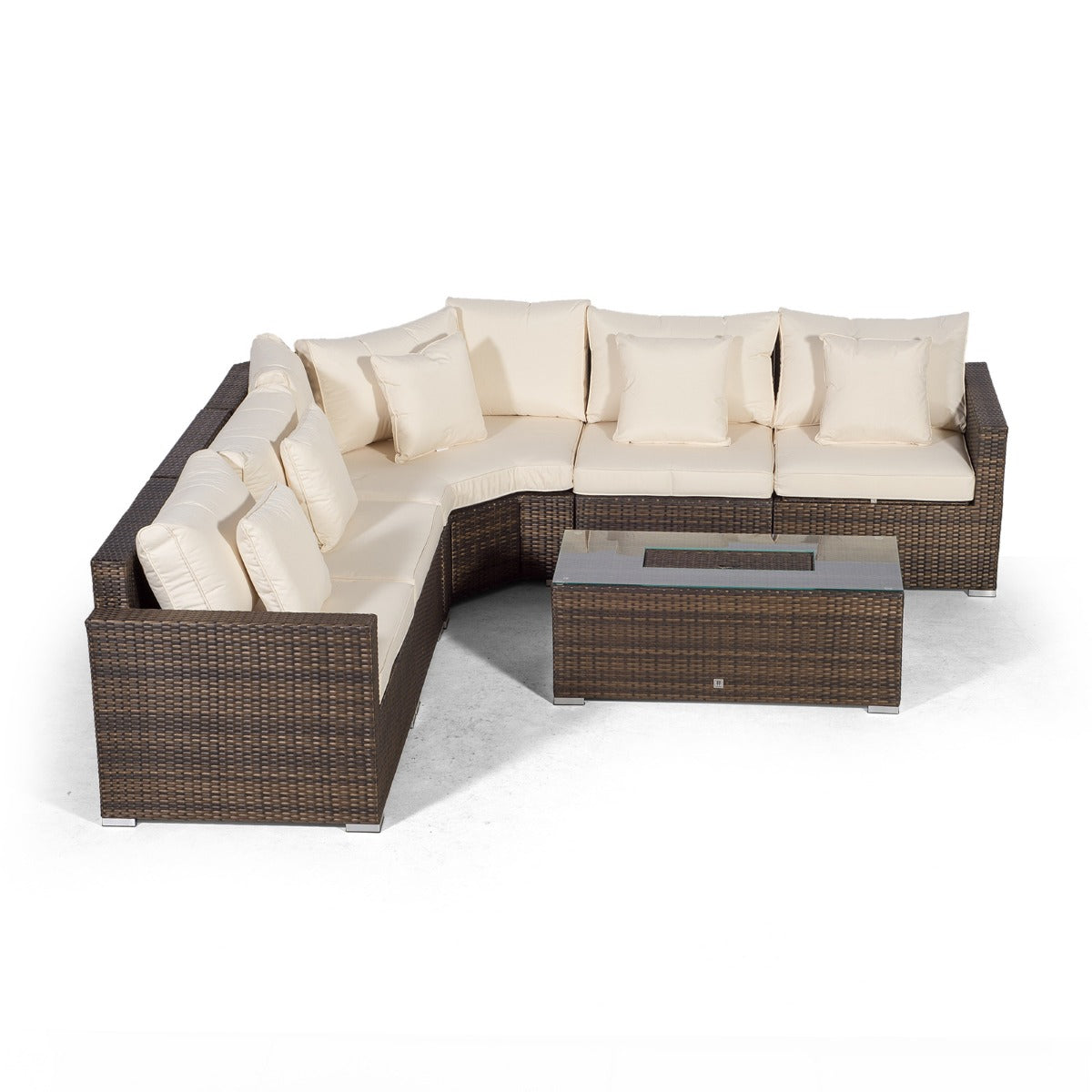 The Santorini 5 seat outdoor corner sofa set with drinks cooler is one of our most stylish and versatile outdoor furniture solutions. Featuring an angled geometric design, the Santorini offers ample seating whilst exuding style and sophistication. Available in a beautifully contrasting mixed brown weave, Santorini is the ideal statement piece for your next garden get-together.
