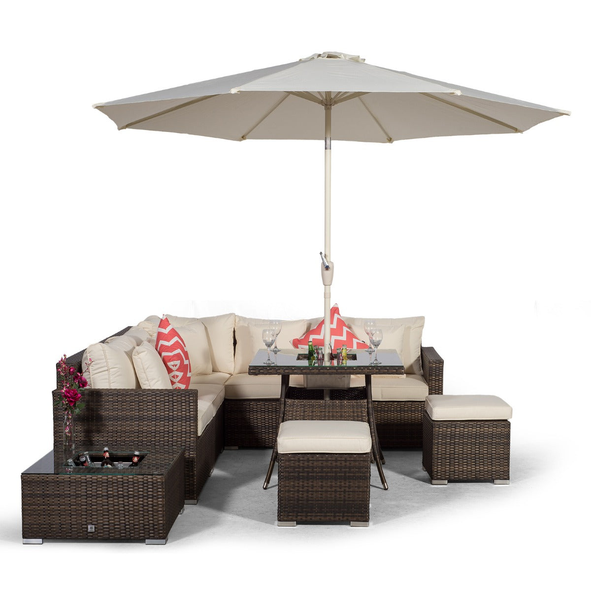 One of the versatile features of this set is that the corner sofa and dining table can be used at the same time independently of each other. The dining table can function separately as a dining set using the stools and parasol included, whilst the sofa set can function independently using the drinks cooler coffee table, providing the ideal setting for casual drinks and snacks.