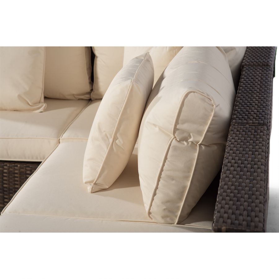 Luxurious multi-density foam and fiber padded cushions make this outdoor sofa set super comfortable. Featuring 10 cm thick seat cushions and 20 cm thick back cushions, the multi density fillings enhance the shape and structure of the cushions, providing comfort and support to your seating arrangement. Our special water-resistant fabrics protect your cushions from showers and all cushions come with removable zip-off covers for easy maintenance. Scatter cushions are included for extra comfort and luxury.