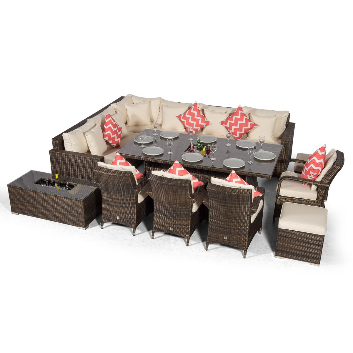 Havana - Modular 10 Seat Drinks Cooler Rattan Corner Sofa Dining Set With Luxury Padded Dining Chairs, Stools & Coffee Table - Brown