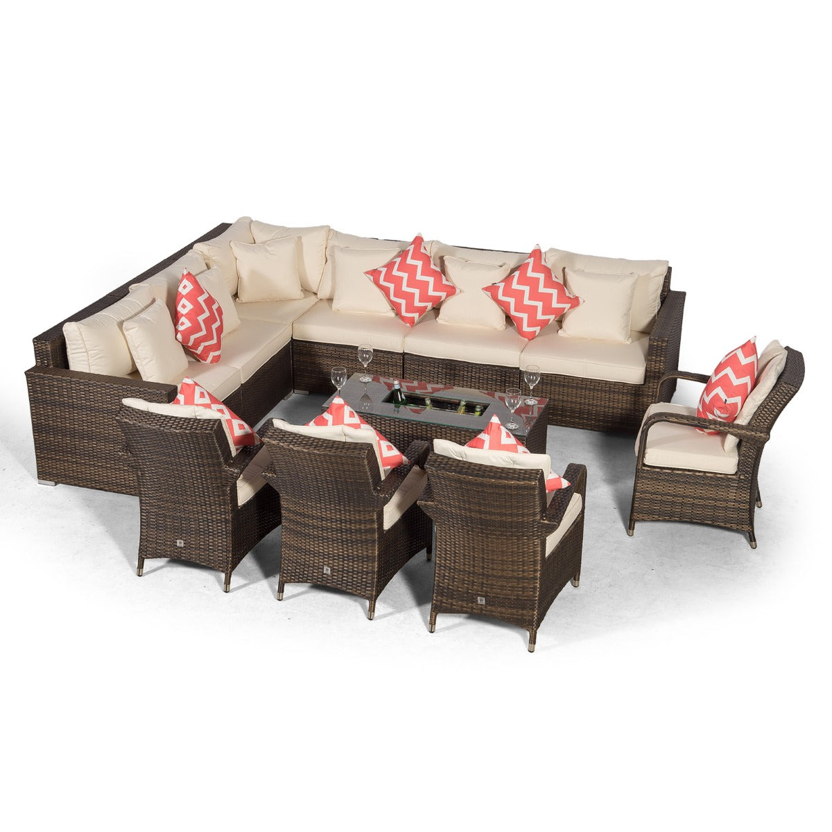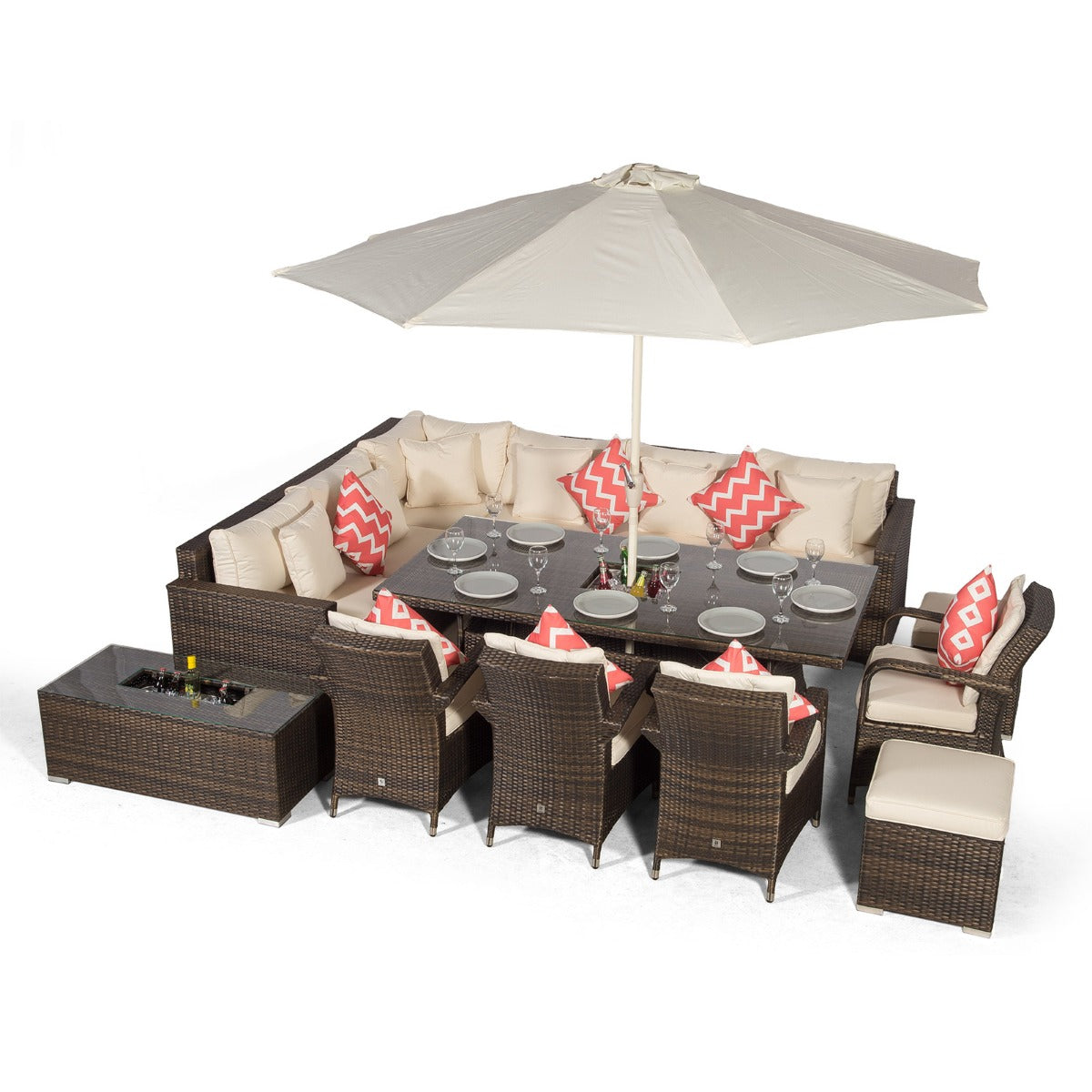 The Havana 10 seater outdoor corner sofa dining set with drinks coolers, is the ideal 2 in 1 solution for outdoor lounging and casual dining. Consisting of 6 spacious modular seats, a 200 x 100cm drinks cooler dining table, 4 luxury padded dining chairs, 2 padded stools and a drinks cooler coffee table, the Havana sofa dining set is available in a beautifully contrasting mixed brown weave.