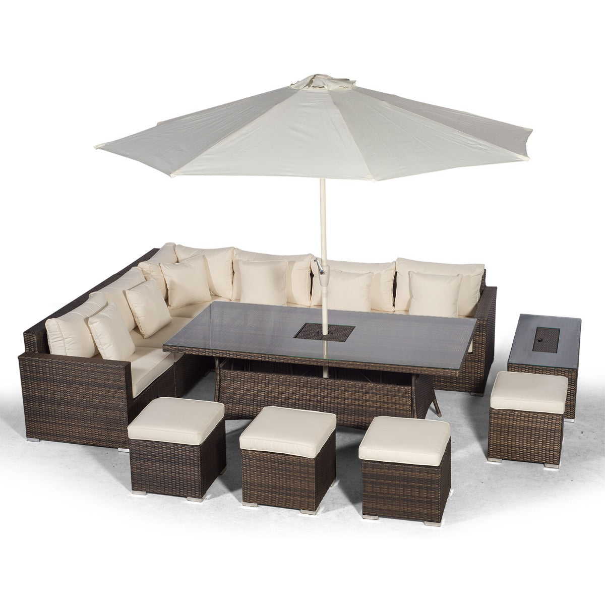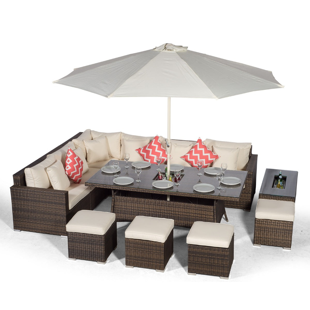 One of the versatile features of this set is that the corner sofa and dining table can be used at the same time independently of each other. The dining table can function separately as a dining set using the stools and parasol included, whilst the 6 seat sofa set can function independently using the drinks cooler coffee table, providing the ideal setting for casual drinks and snacks.