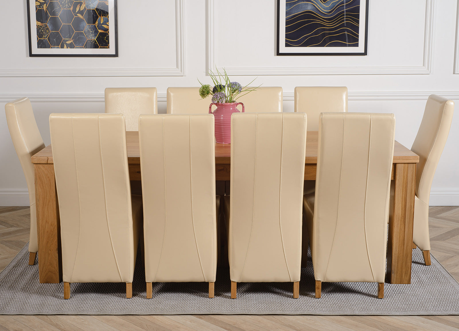 This dinner table and chairs set comes with 10 Lola leather dining chairs upholstered in bonded ivory leather with solid oak legs, hardwood frame and a sprung seat for exceptional comfort and durability.