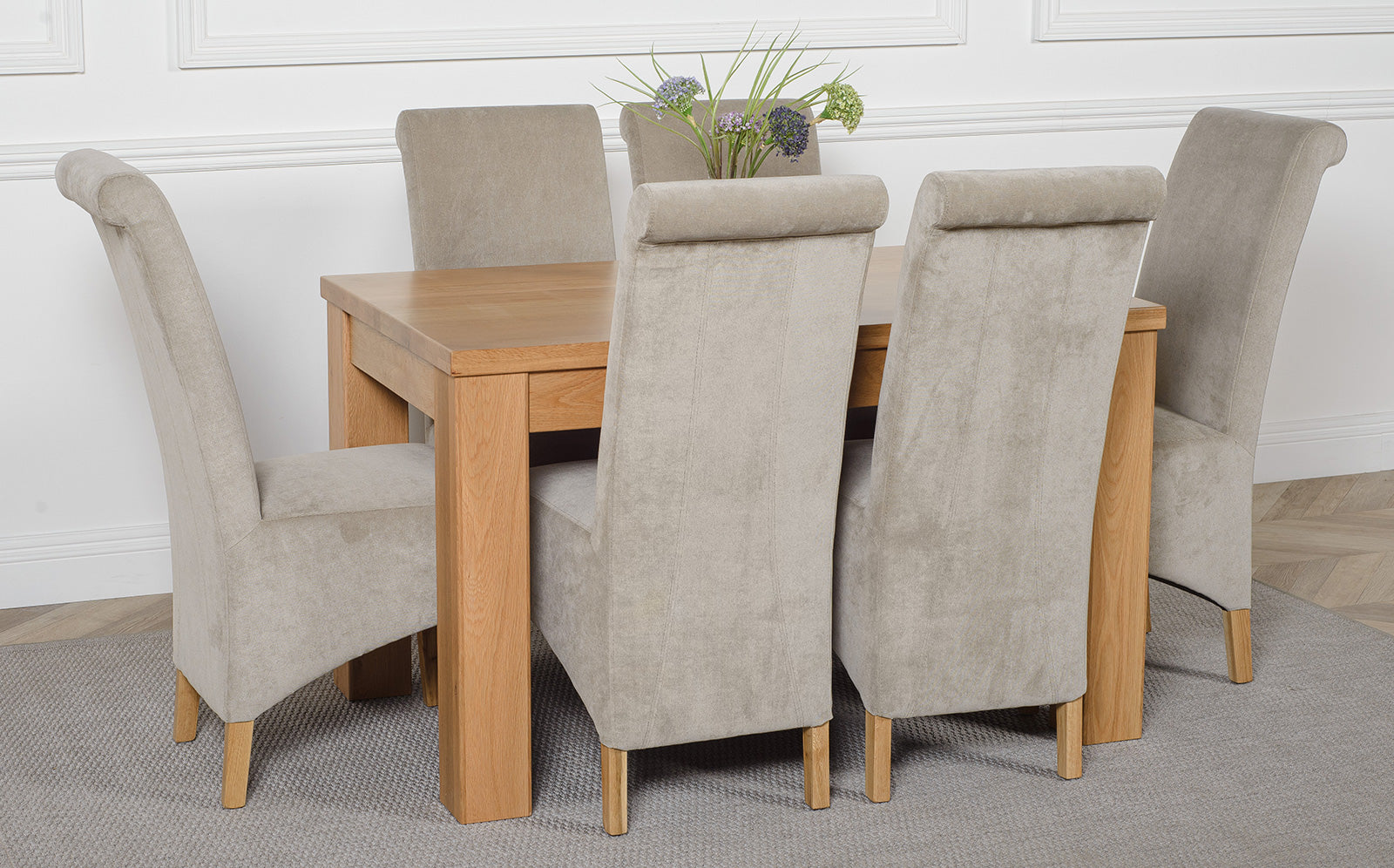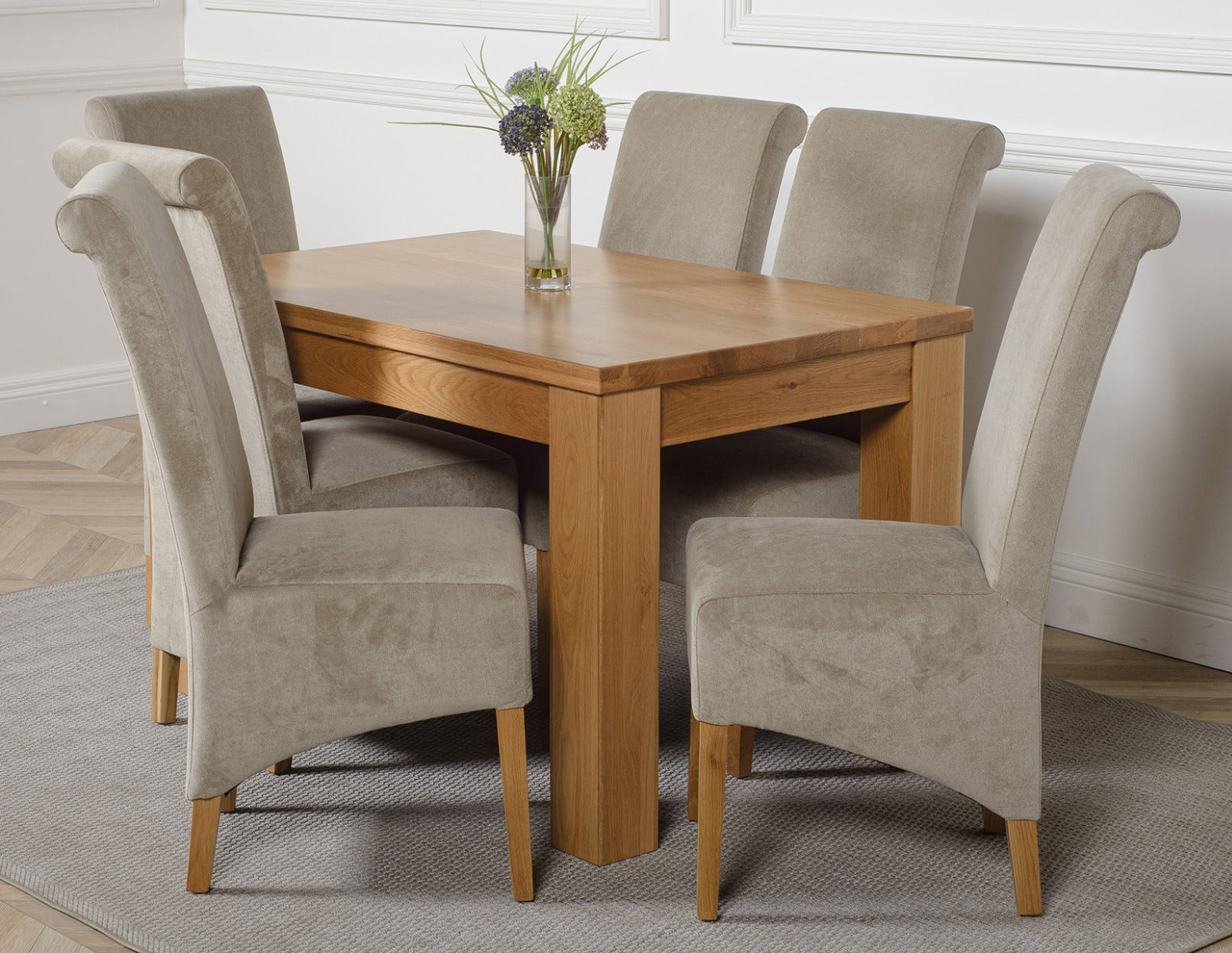 This dinner table and chairs set comes with 6 Montana dining chairs upholstered in luxurious grey fabric with oak legs, hardwood frames and sprung seats for exceptional comfort and durability.