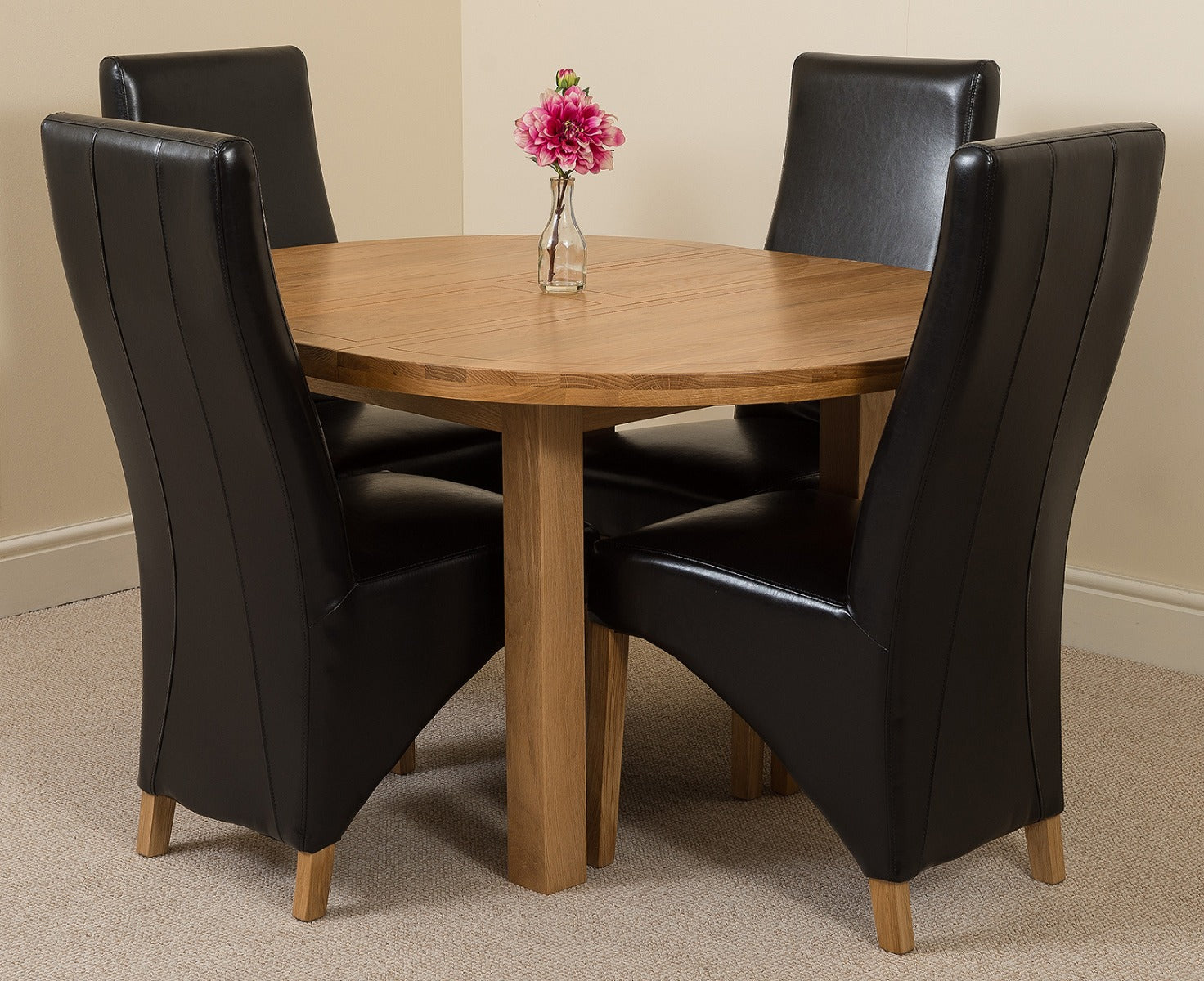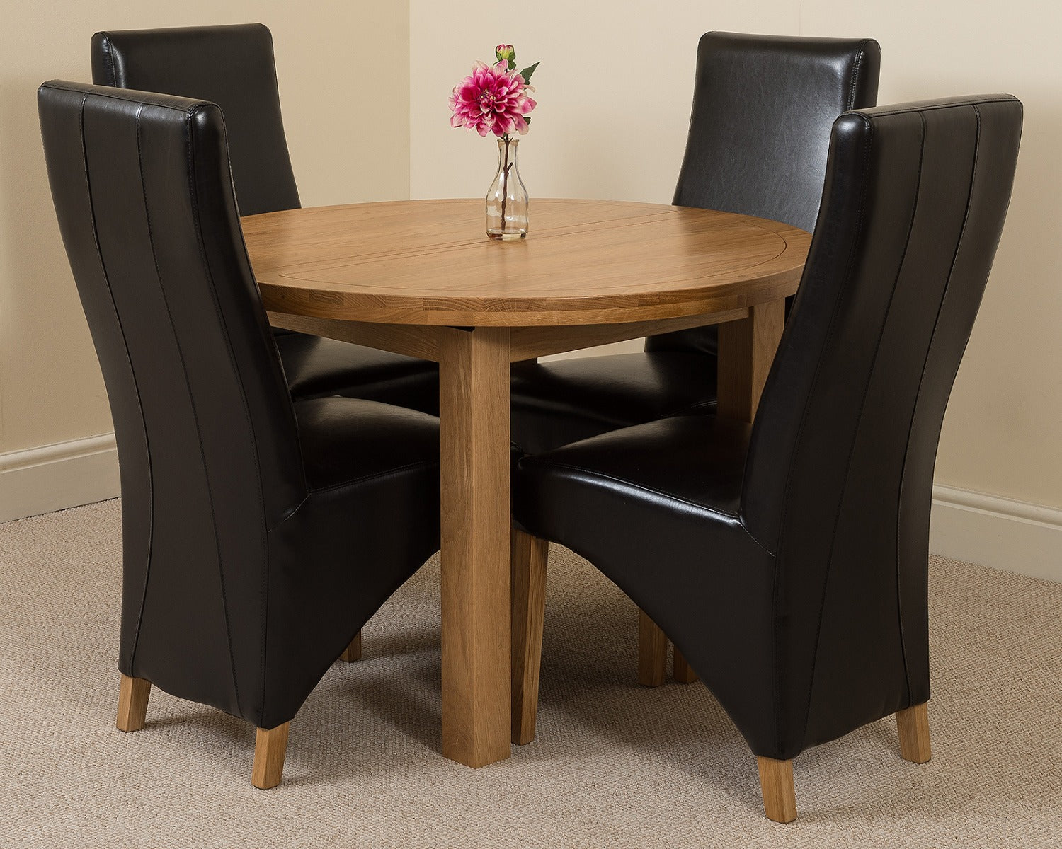 Edmonton Round Extendable Oak Dining Set with 4 Lola Black Leather Chairs