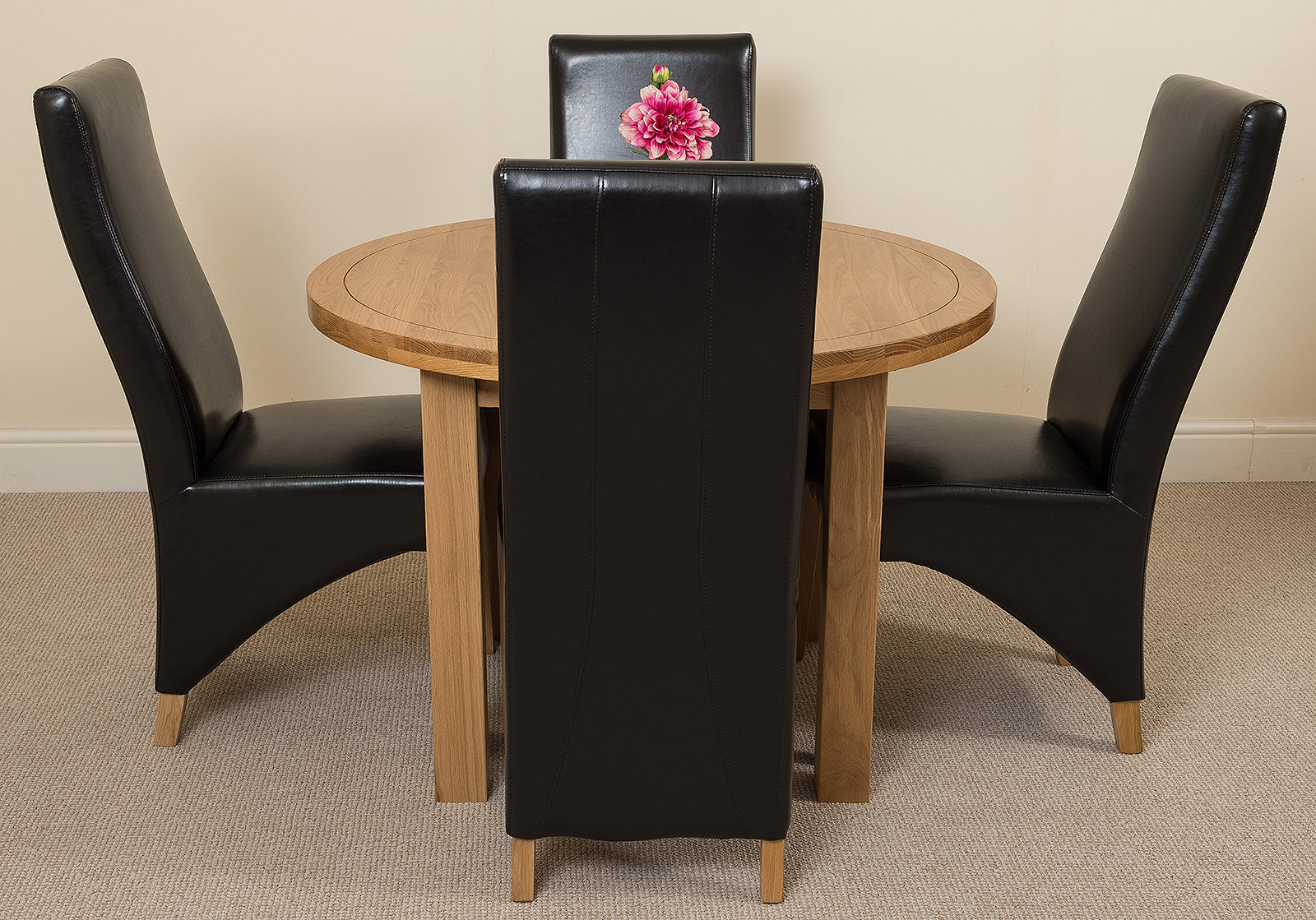 The Edmonton round oak extending dining table comes complete with 4 Lola wave back leather dining chairs, fully upholstered in medium-density foam and black bonded leather. The chairs feature solid oak wood legs, hardwood frame and a sprung seat for exceptional comfort and durability. As a testament to their quality, the Lola dining chairs require no assembly and come fully built from the factory.