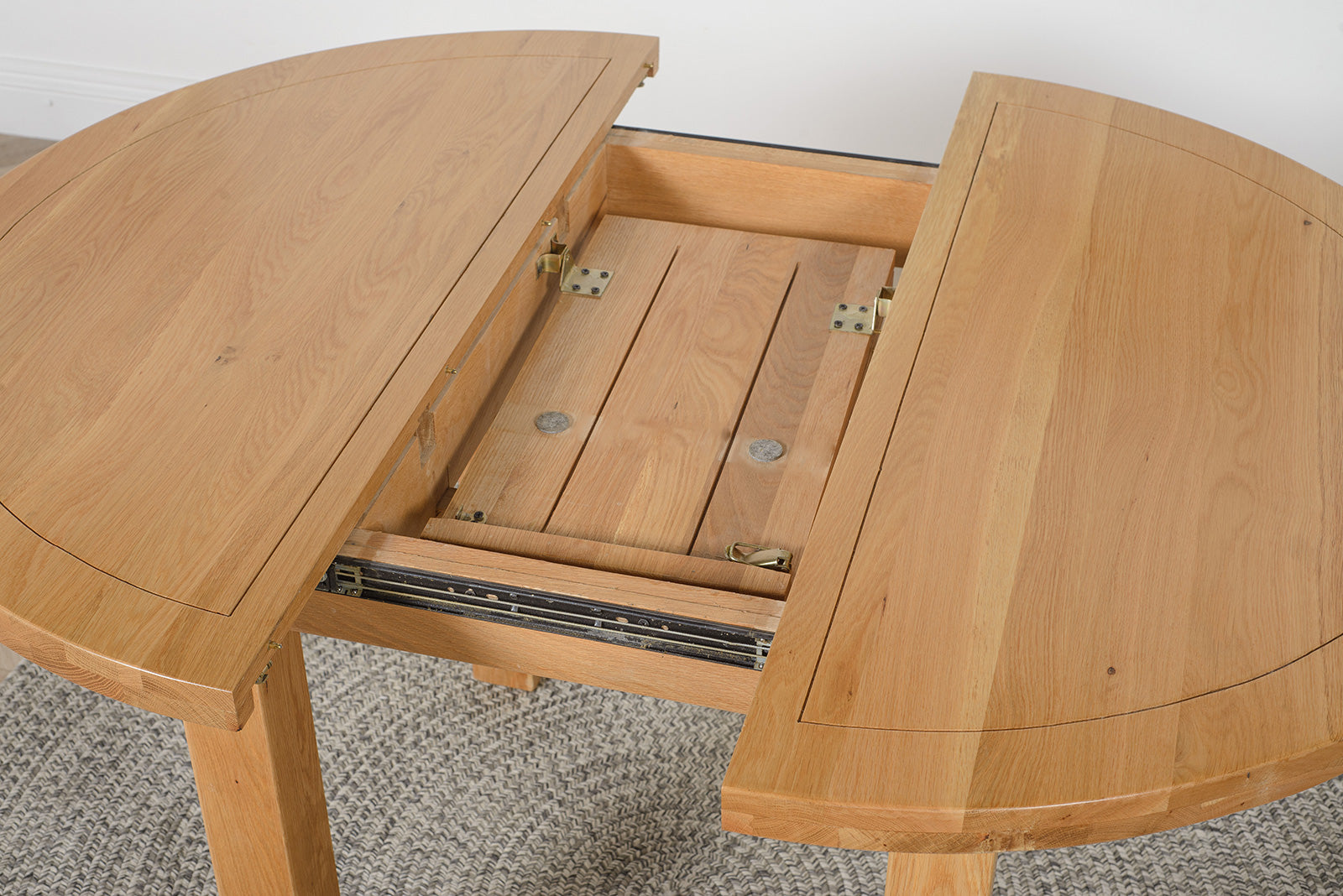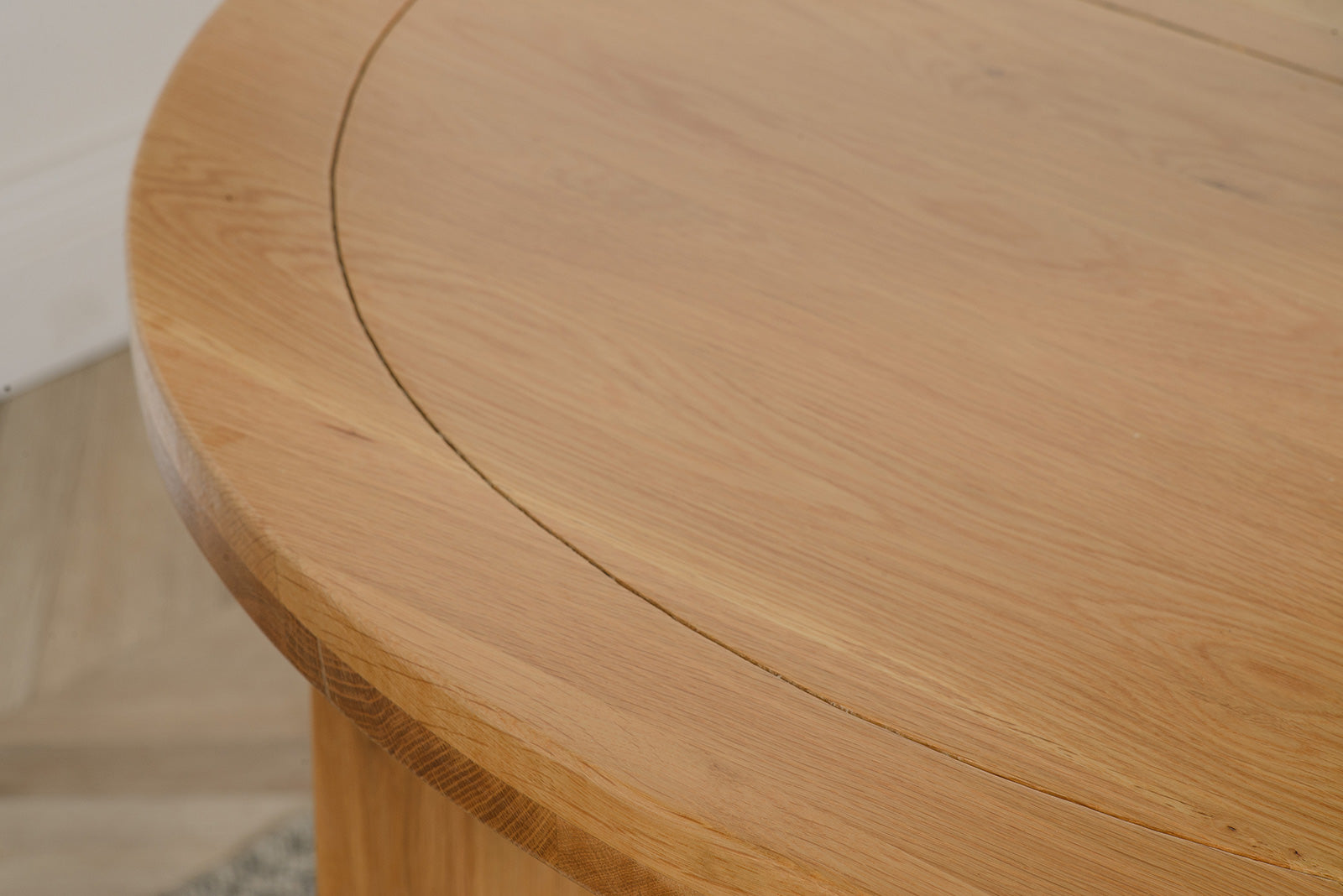 Ideal for accommodating last-minute meal time guests, this small oak dining table can seat up to 6 people when extended and 4 when not extended. The handy extension mechanism fitted at the center of the table effortlessly adds an extra 30cm to the length of the table, which measures 110cm in diameter as standard and 140 x 110cm when extended. The chunky solid oak legs look great on this light oak extending dining table and provide a sturdy foundation.