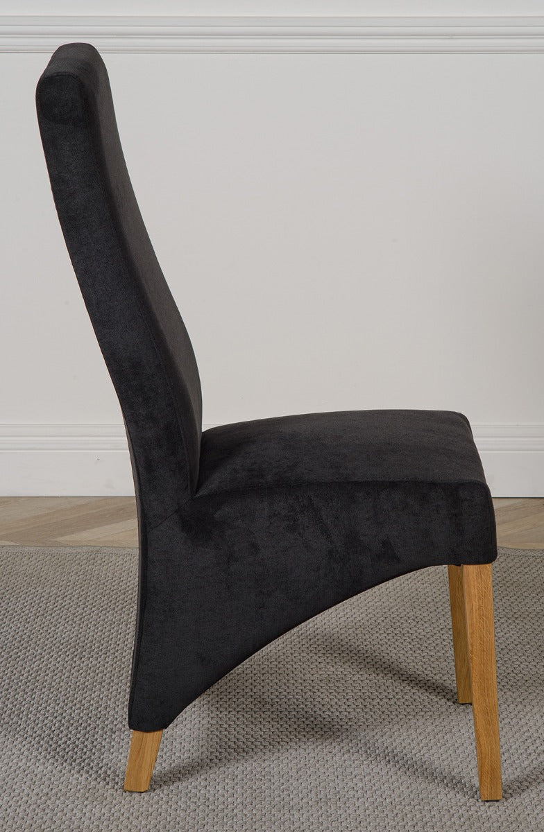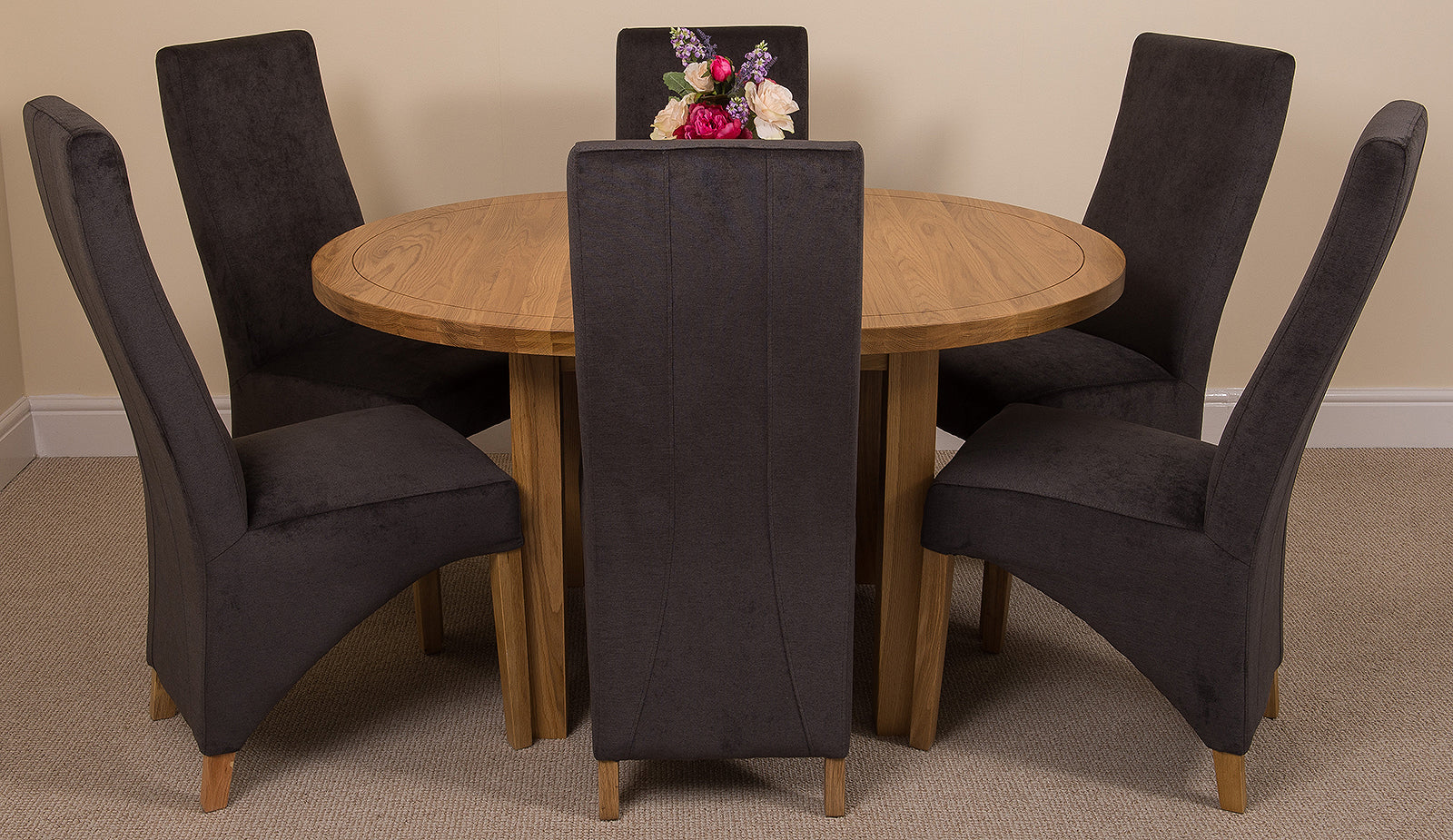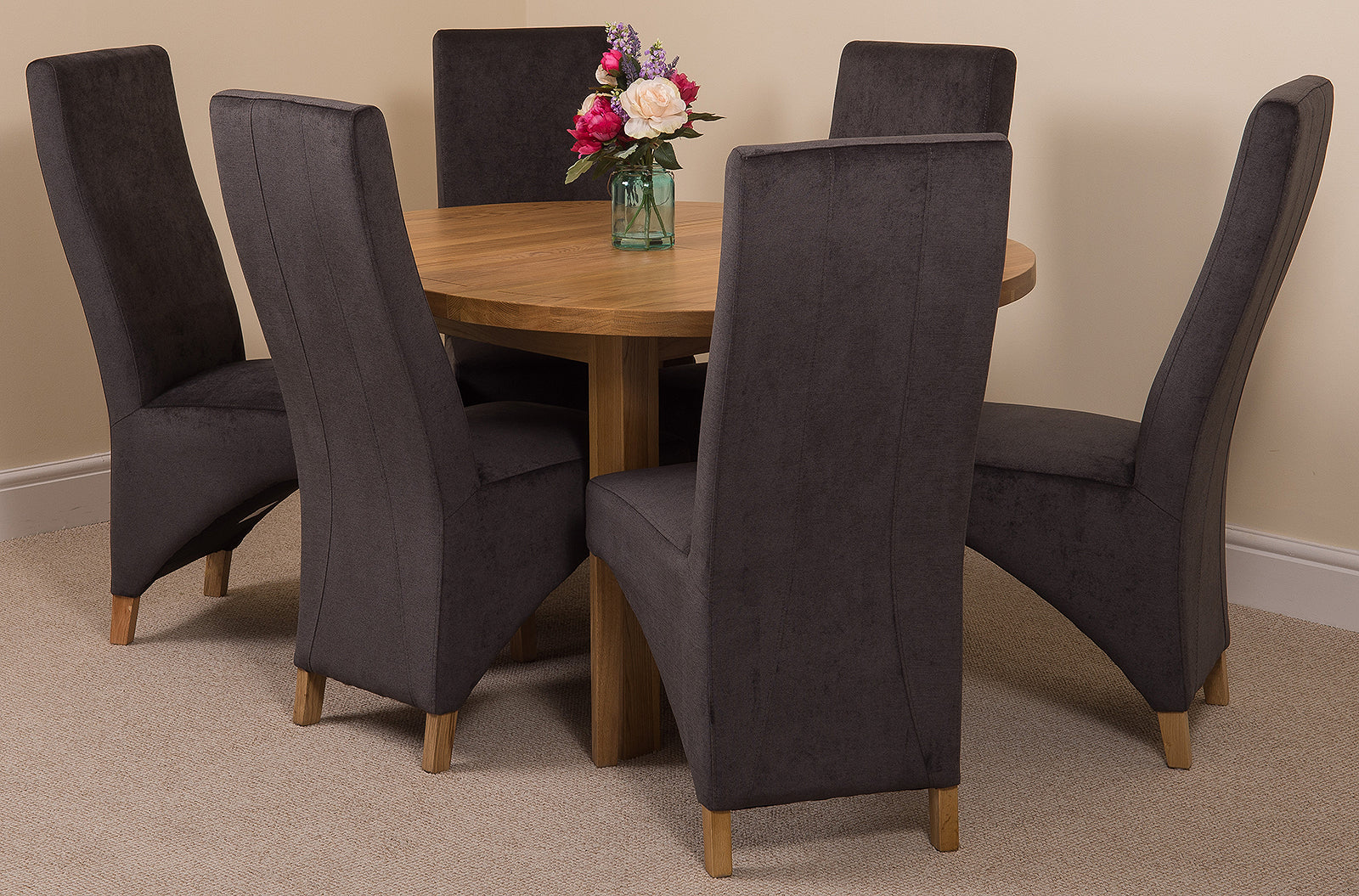 The Edmonton round oak extending dining table comes complete with 6 Lola wave back fabric dining chairs, fully upholstered in medium-density foam and luxury soft black colour fabric. The chairs feature solid oak wood legs, hardwood frame and a sprung seat for exceptional comfort and durability. As a testament to their quality, the Lola dining chairs require no assembly and come expertly built from the factory.
