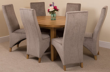 The Edmonton round oak extending dining table comes complete with 6 Lola wave back fabric dining chairs, fully upholstered in medium-density foam and luxury soft grey colour fabric. The chairs feature solid oak wood legs, hardwood frame and a sprung seat for exceptional comfort and durability. As a testament to their quality, the Lola dining chairs require no assembly and come expertly built from the factory.