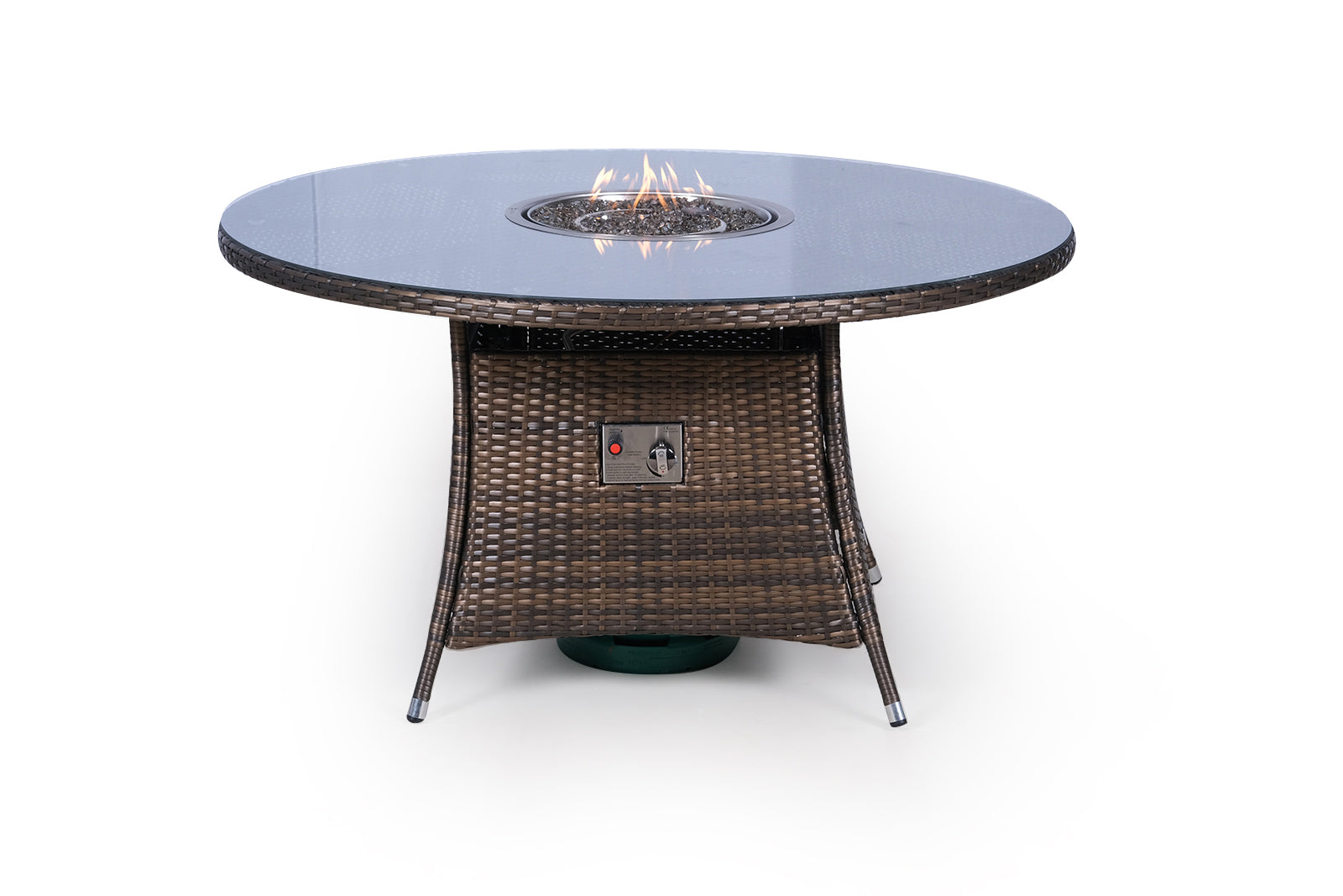 All our fire pit sets are made of 304 stainless steel and are CE and UKCA approved and come with a clip-on regulator. We recommend using the small green 5kg propane gas bottles which fit under the garden table and are estimated to provide between 4-5 hours of constant burn time on full power. Burn time can be extended by operating the fire pit on lower heat settings.