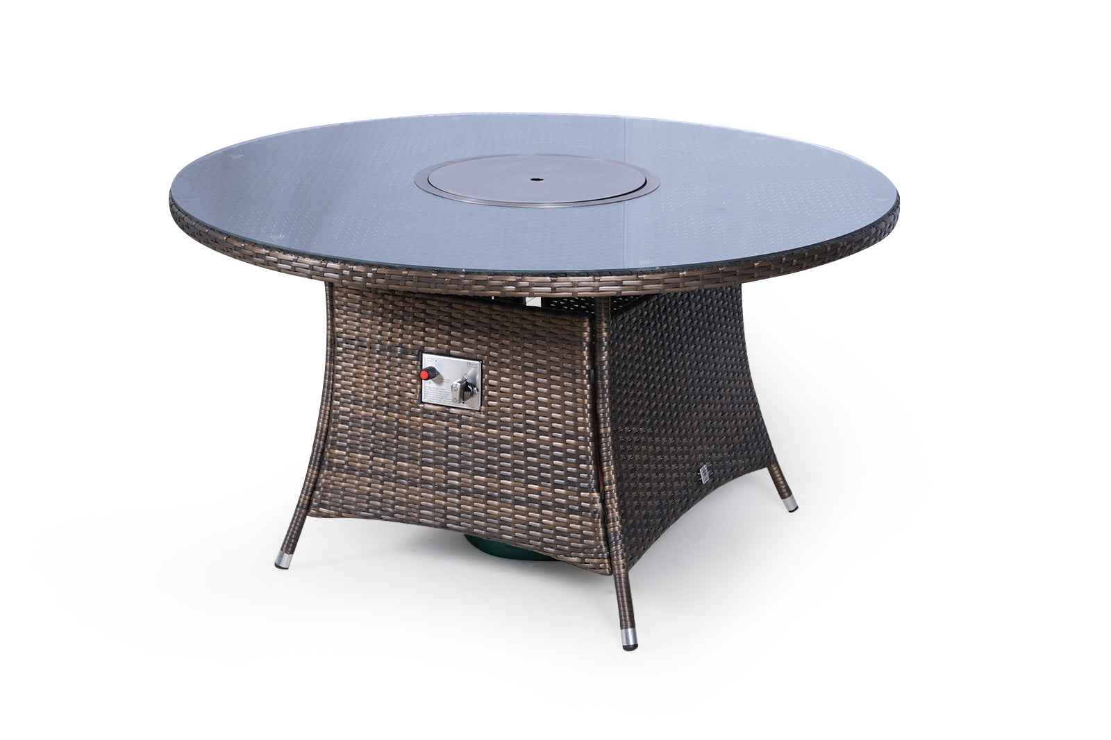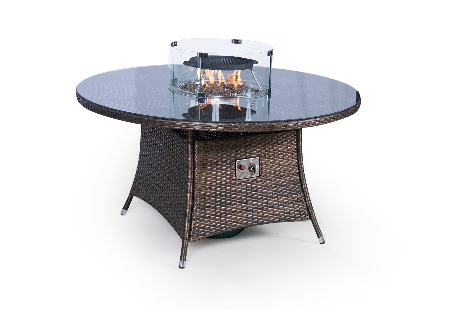 The fire pit dining table comes complete with an electronic ignition control panel featuring adjustable heat settings, tempered glass safety shield, stainless steel cover, decorative long lustre fire glass and BBQ griddle, providing everything you need to enjoy those long summer evenings in comfort and style.