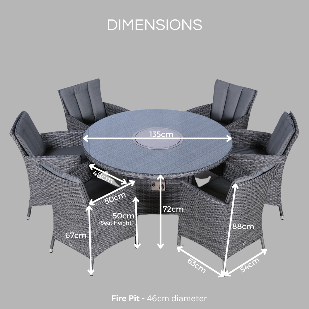 Available in a stunning mixed brown weave or the ultra stylish mixed grey weave, the Savannah garden patio set consists of a feature packed 135cm gas fire pit table, 6 padded dining chairs and all weather cover, providing everything you need to enjoy alfresco family meals in comfort and style.