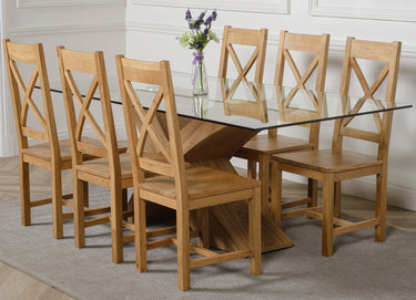 The Valencia large dining table and 6 chairs dining set is a stylish combination of glass and wood, crafted from 12mm thick tempered glass with a striking X shaped base made with real wood veneer finished in a natural oak colour. Combined with the comfortable Berkeley oak chairs this versatile dining table set will be the focal point of any kitchen or dining room setting.