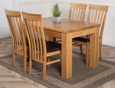 This dinner table and chairs set comes complete with 4 fully assembled Harvard slat back oak dining chairs, made from solid oak with padded seats upholstered in brown bonded leather.