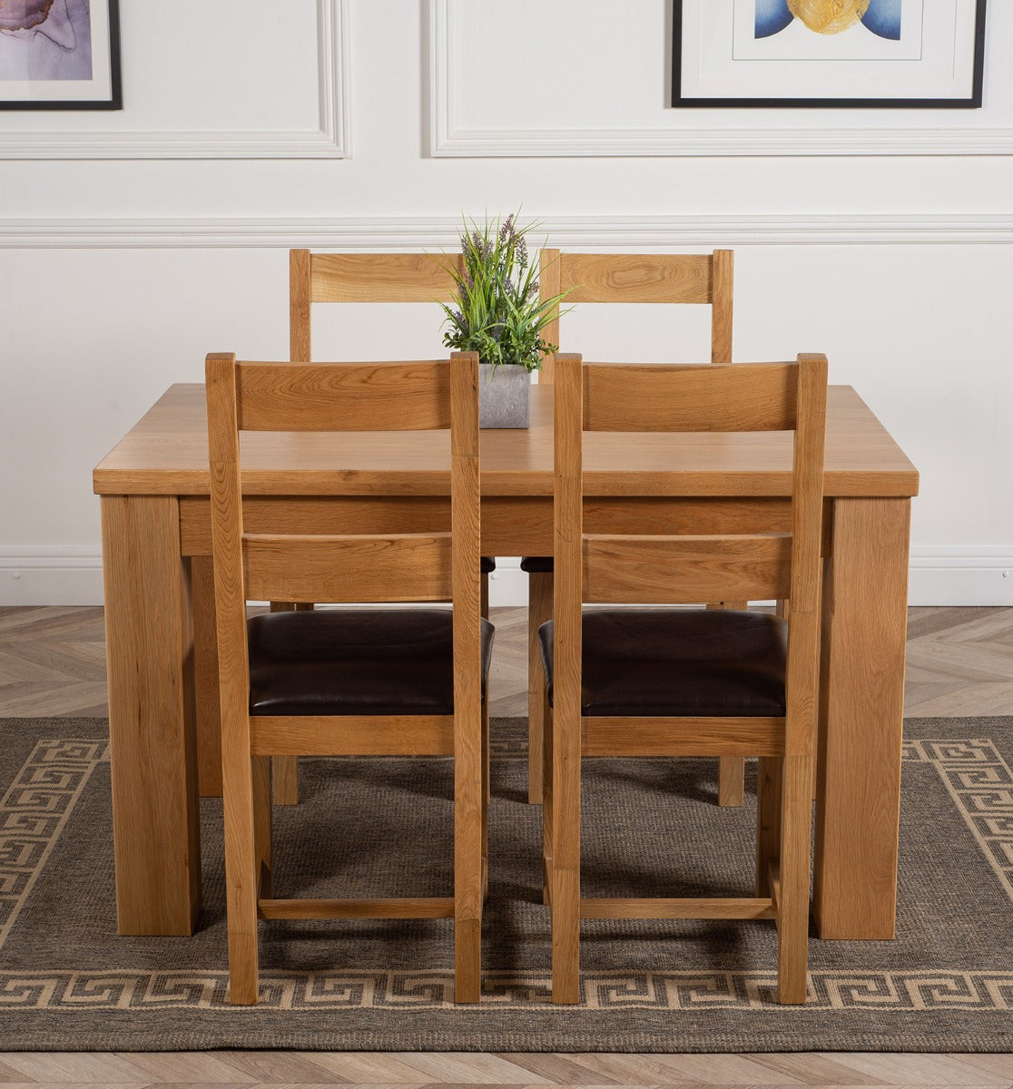 The Dakota 4 seater dining table with chairs is the perfect choice for a smaller home in need of a high calibre oak table and chairs to comfortably seat four people. Ideal for use in a kitchen diner or open plan living room, the Dakota oak dining set will undeniably be the centerpiece of your home.