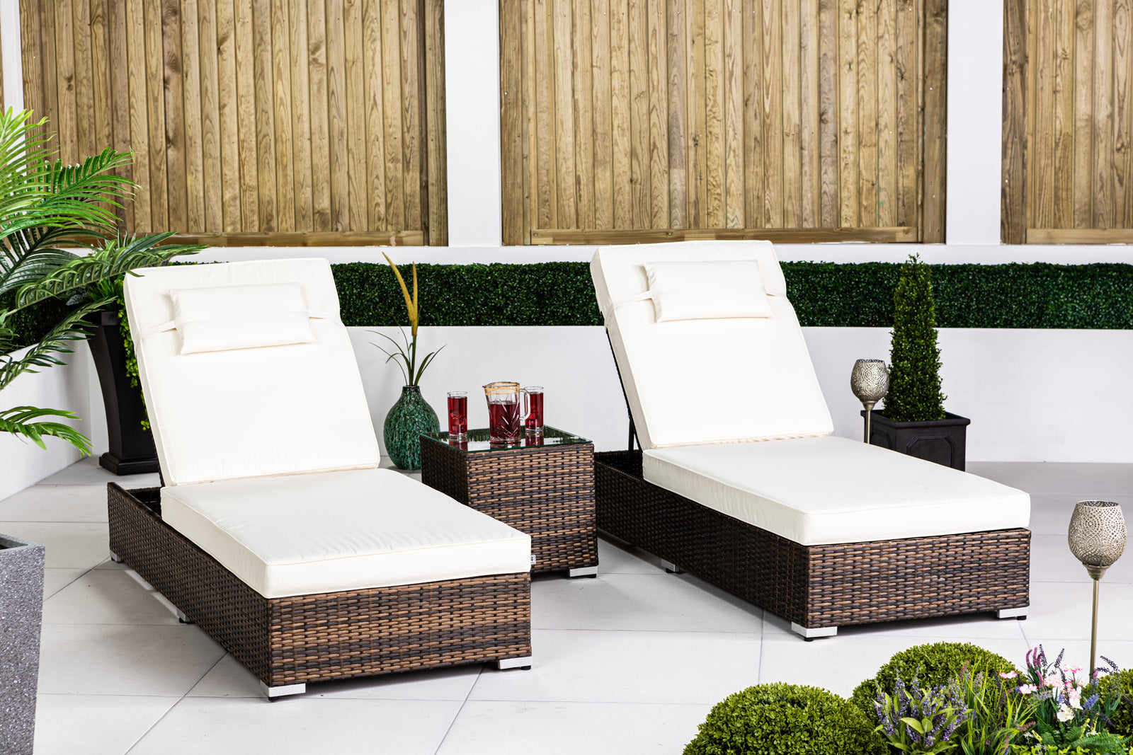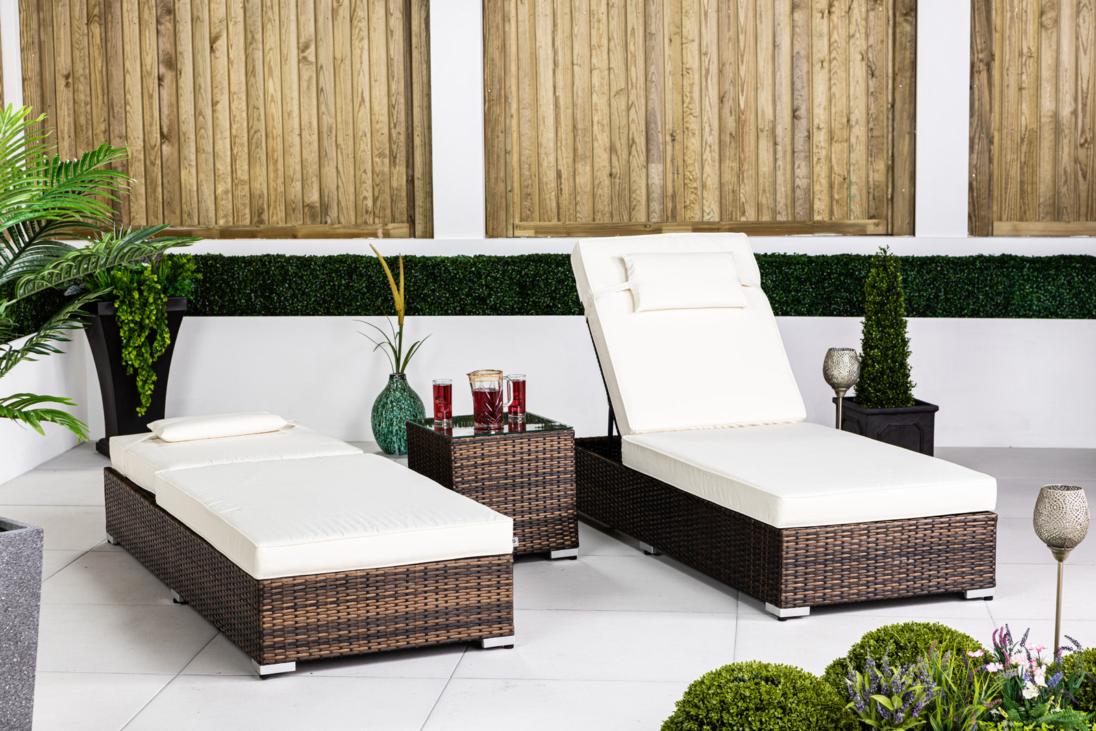 Upgrade your outdoor space today with these luxurious brown rattan sun loungers. Whether you’re lounging solo or sharing the comfort with a loved one, the Giardino set is the ultimate choice for creating a serene and sophisticated retreat in your garden.