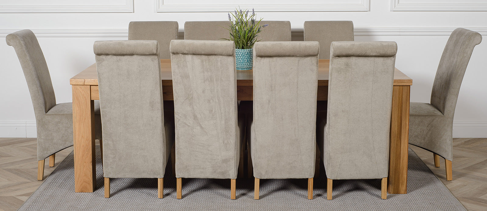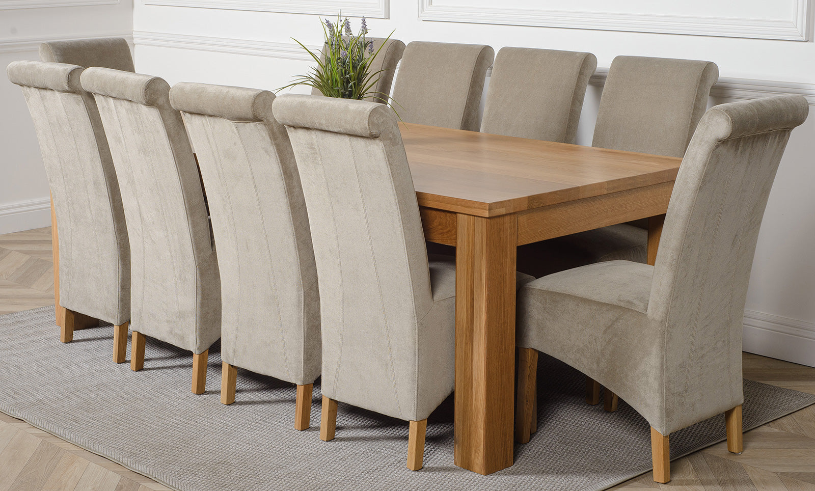 This dinner table and chairs set comes with 10 Montana dining chairs upholstered in luxurious grey fabric with oak legs, hardwood frames and sprung seats for exceptional comfort and durability.