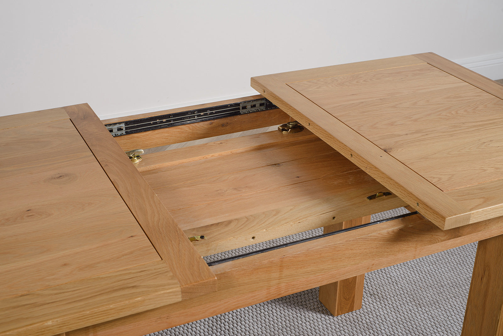 This extending oak dining table and chairs is ideal for formal entertaining or casual family dining. Standing on chunky solid 10x10cm wooden legs, this oak extendable dining table and chairs will fit into any modestly-sized room. Standing at a height of 77cm the solid oak table top measures 120 x 80cm when closed and extends to 160cm in length using the 40cm extension panel stored under the table top, comfortably accommodating up to 6 people.