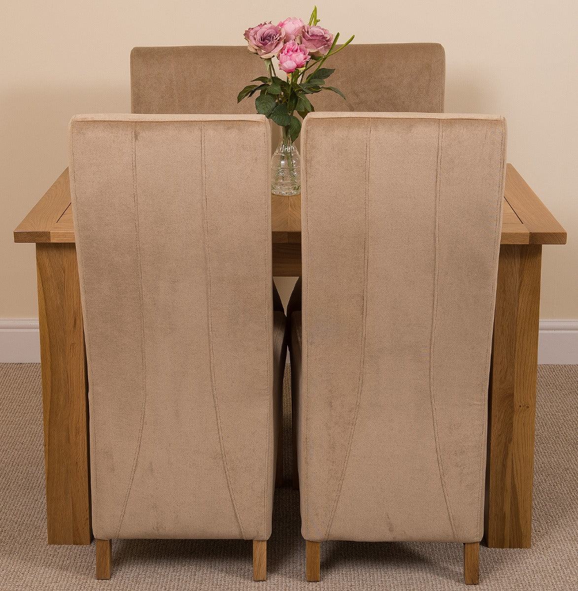 The Hampton extendable oak dining table set comes complete with 4 Lola wave back oak and fabric dining chairs, fully upholstered in medium-density foam and beige fabric. The chairs feature solid oak wood legs, hardwood frame and a sprung seat for exceptional comfort and durability. As a testament to their quality, the Lola dining chairs require no assembly and come fully built from the factory.
