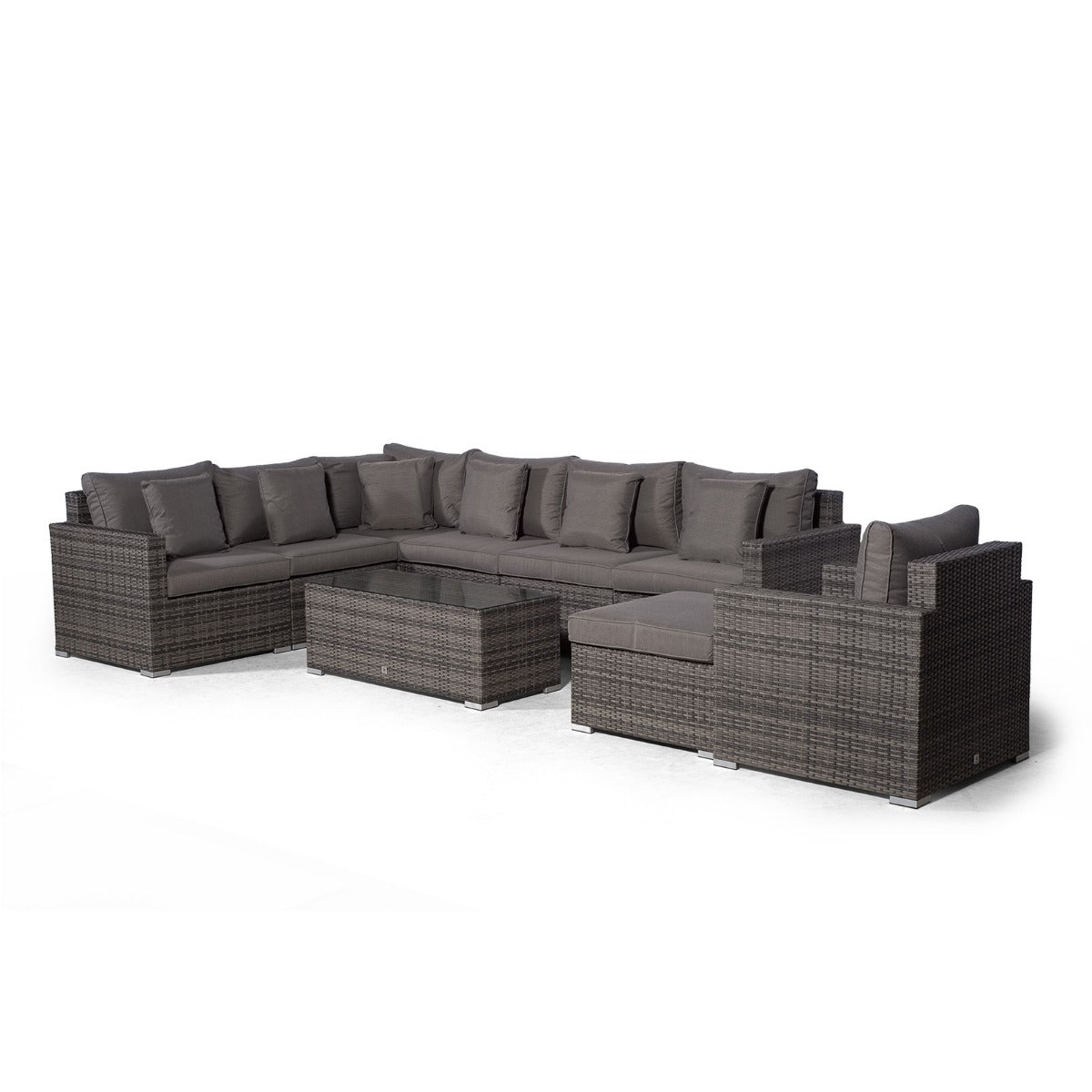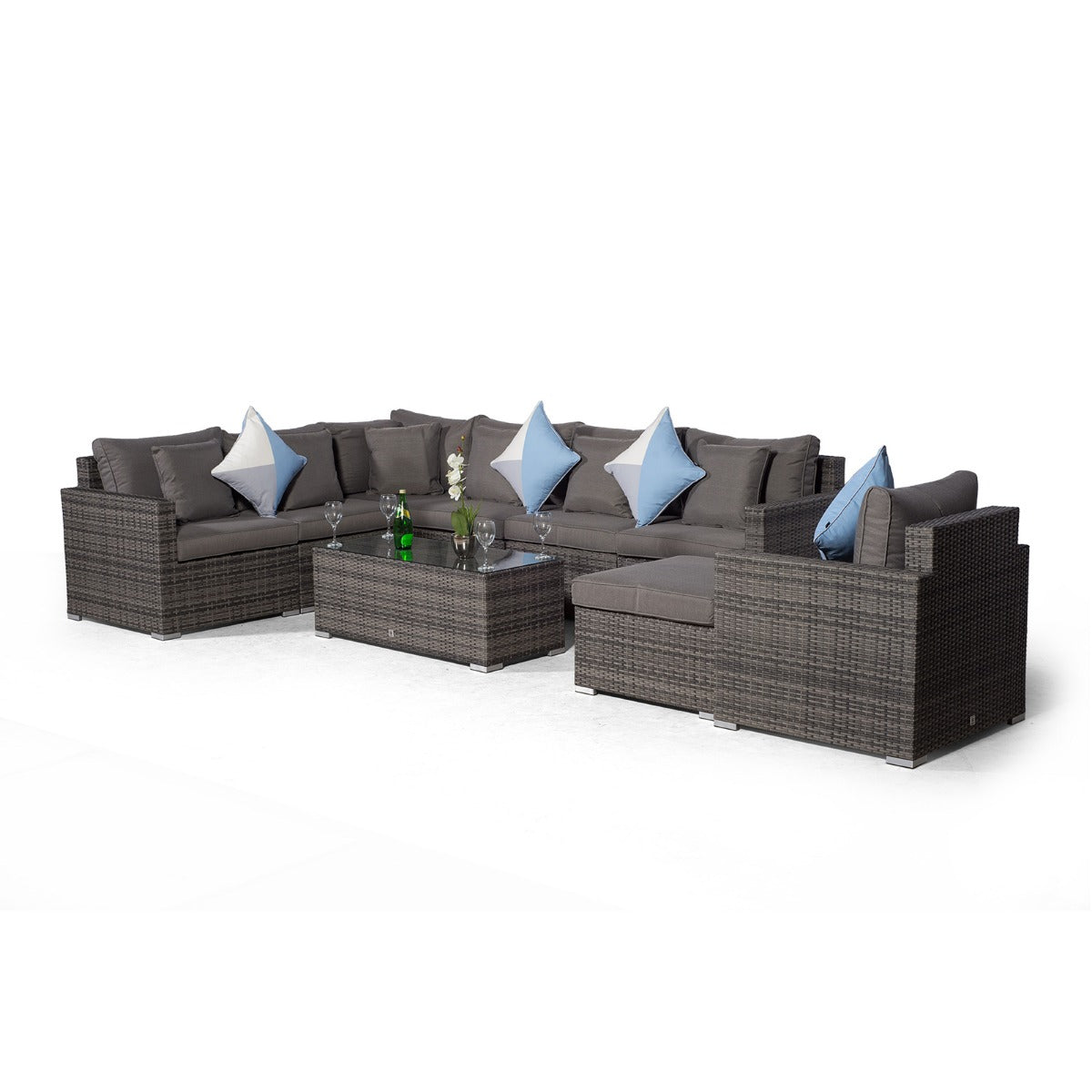 The end seats feature adjustable bases which effortlessly convert your sofa into comfortable sun loungers to soak up the sun, whilst the square glass top coffee table provides the perfect setting for drinks and snacks.