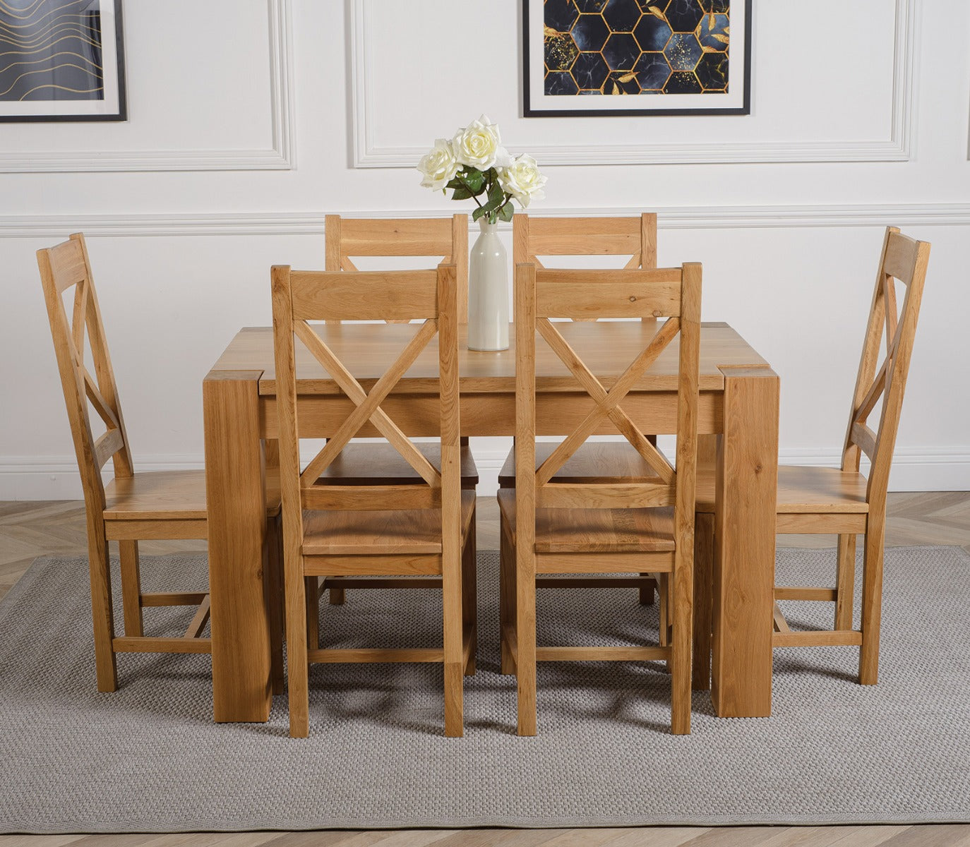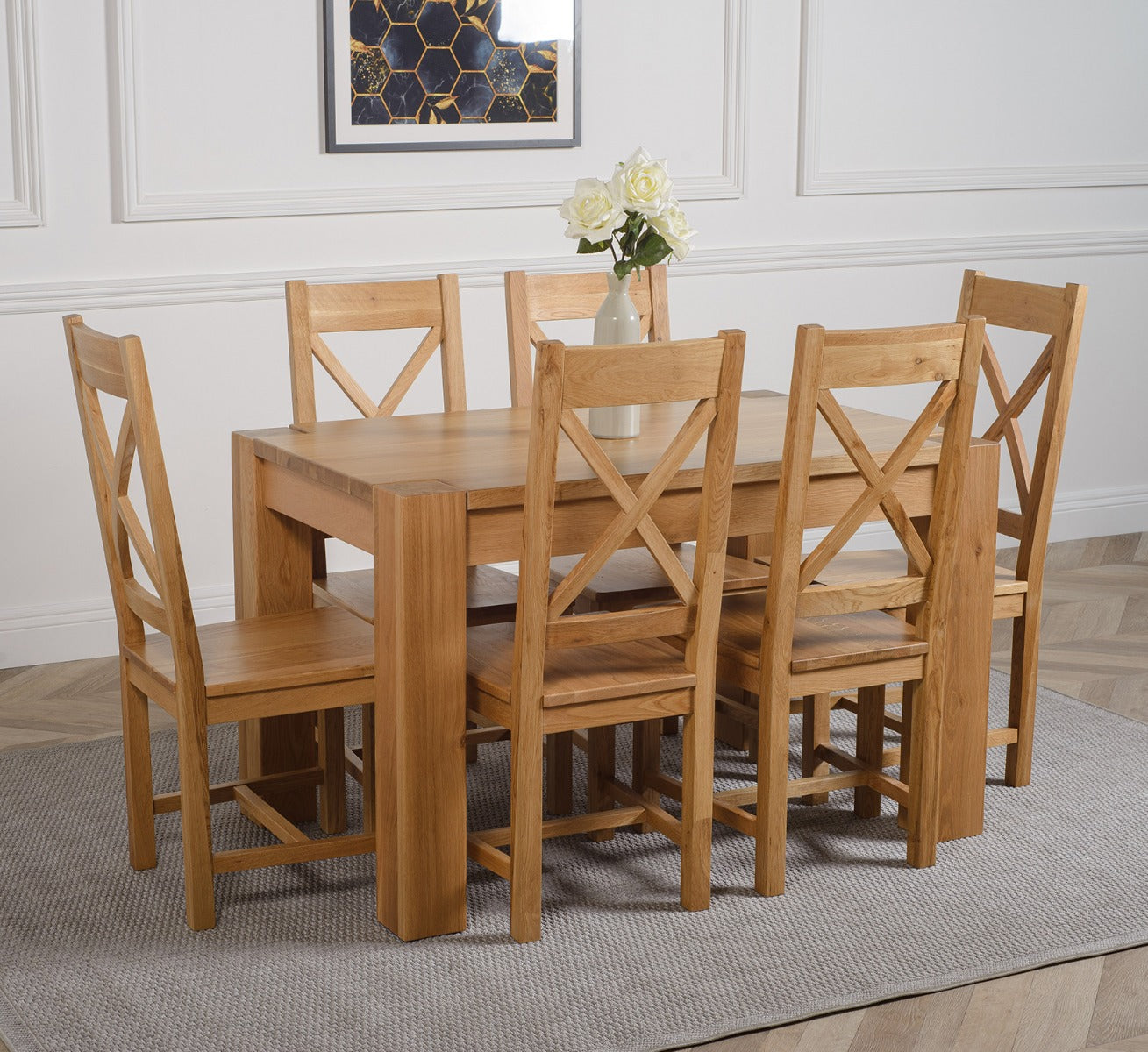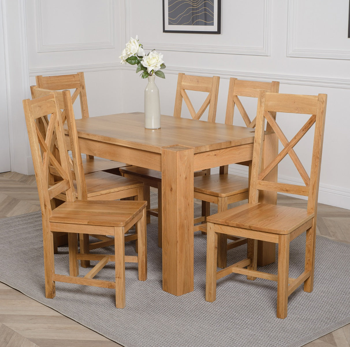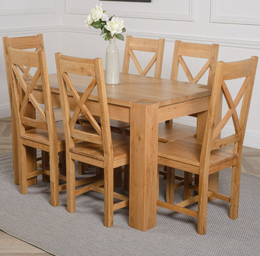 The Kuba oak dining table set comes complete with 6 fully assembled Berkeley oak dining chairs made from solid oak with a cross back design, durable solid oak seats and braced legs for extra support.