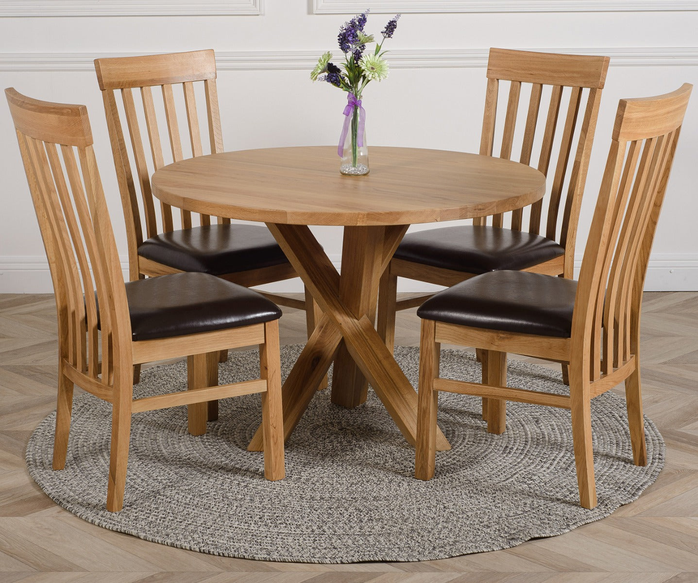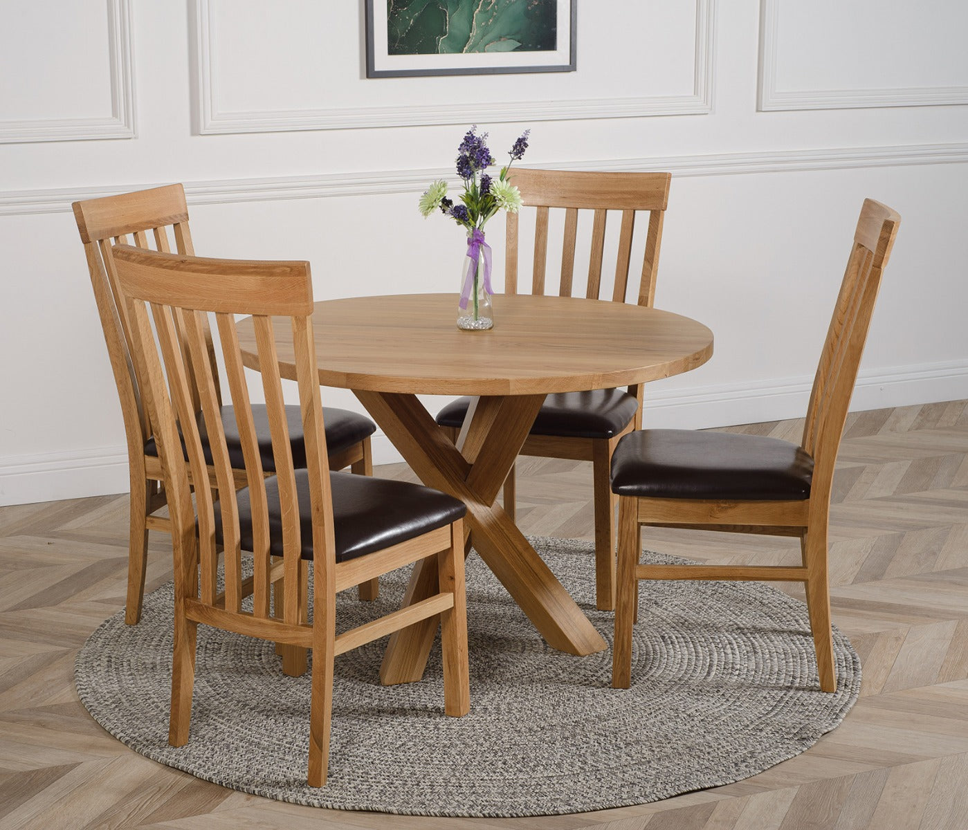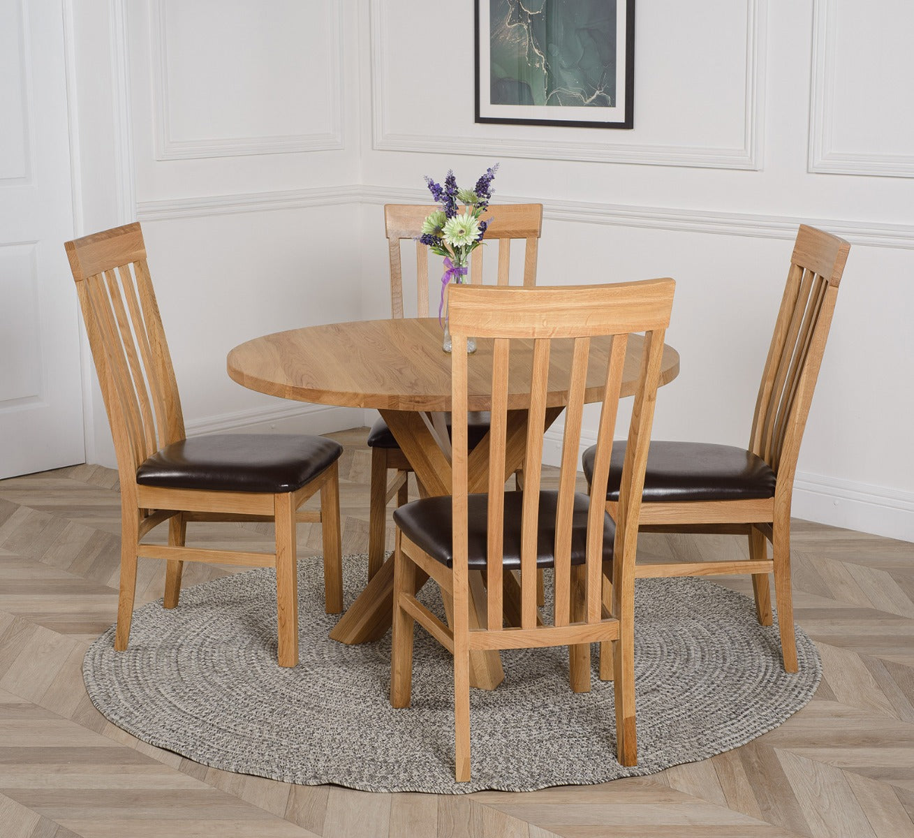 This round table and chairs set comes complete with 4 fully assembled Harvard slat back oak dining chairs, made from solid oak with padded seats upholstered in brown bonded leather.