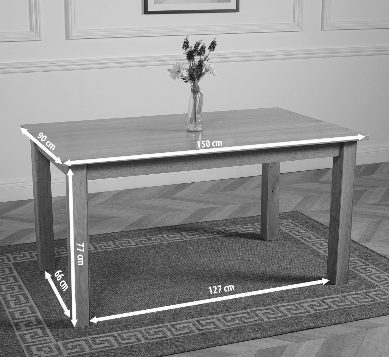 A comfortable dining table with chairs, measuring 150 x 90cm, this dining table set is practical and easy to maintain thanks to its no fuss wipe clean lacquer wood seal.