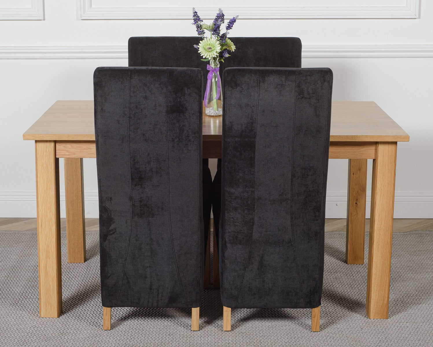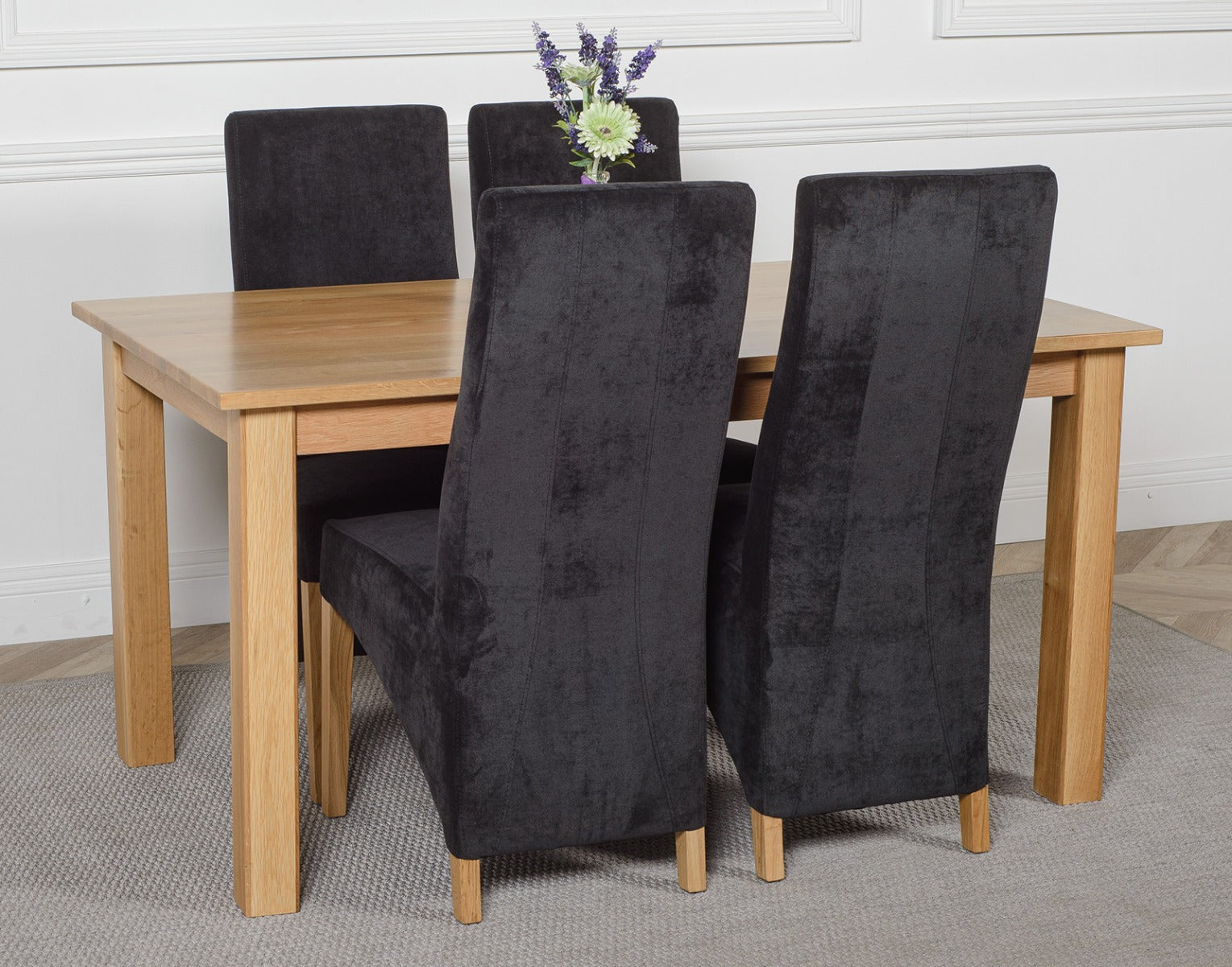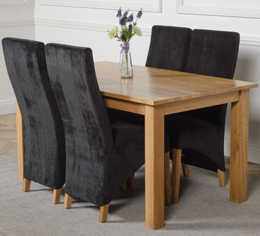 This medium table and chairs comes with 4 Lola black fabric dining chairs upholstered in fabric with solid oak legs, hardwood frame and a sprung seat for exceptional comfort and durability.