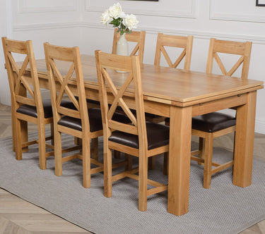 This high quality wooden dining table set comes complete with 6 fully assembled Berkeley oak dining chairs made from solid oak with a cross back design, comfortable cushioned brown leather seat and braced legs for extra support.