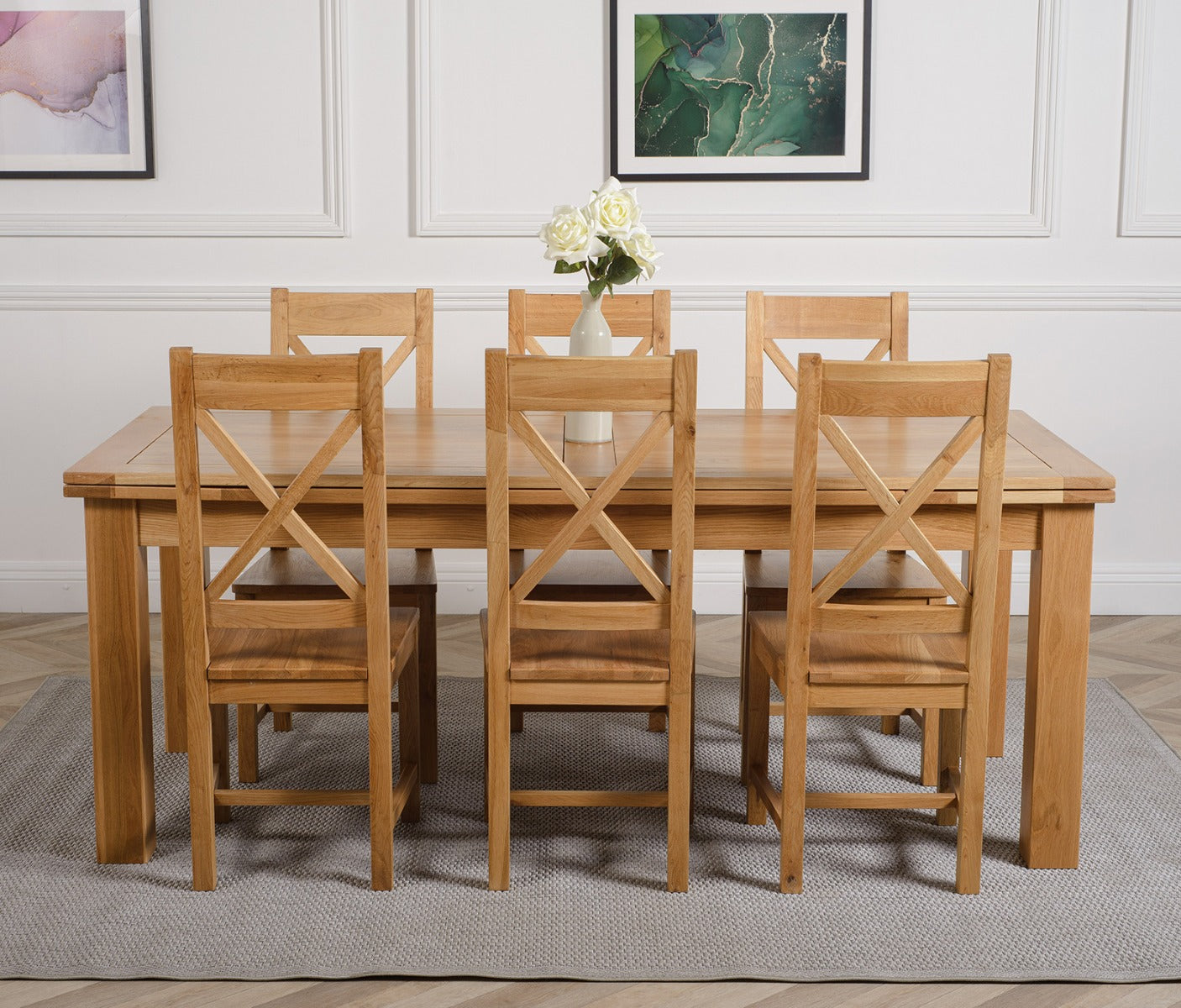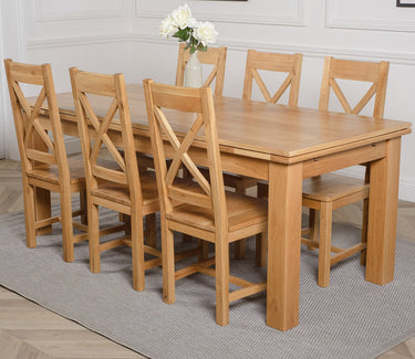 This high quality wooden dining table set comes complete with 6 fully assembled Berkeley oak dining chairs made from solid oak with a cross back design, durable solid oak seats and braced legs for extra support.