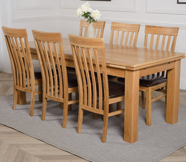 6 x premium Harvard oak dining chairs are included in this high quality wooden dining table set. The Harvard slat back oak dining chairs are made from solid oak timber with a medium-density padded seat and upholstered in brown bonded leather. Traditional yet stylish these solid oak chairs are the perfect companion for the Richmond oak extending dining table with their curved back design and braced legs. As a testament to their quality, the Harvard oak dining chairs require no assembly and come expertly crafted and built.