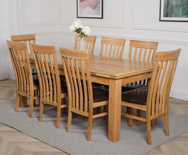 8 x premium Harvard oak dining chairs are included in this high quality wooden dining table set. The Harvard slat back oak dining chairs are made from solid oak timber with a medium-density padded seat and upholstered in brown bonded leather. Traditional yet stylish these solid oak chairs are the perfect companion for the Richmond oak extending dining table with their curved back design and braced legs. As a testament to their quality, the Harvard oak dining chairs require no assembly and come expertly crafted and built.