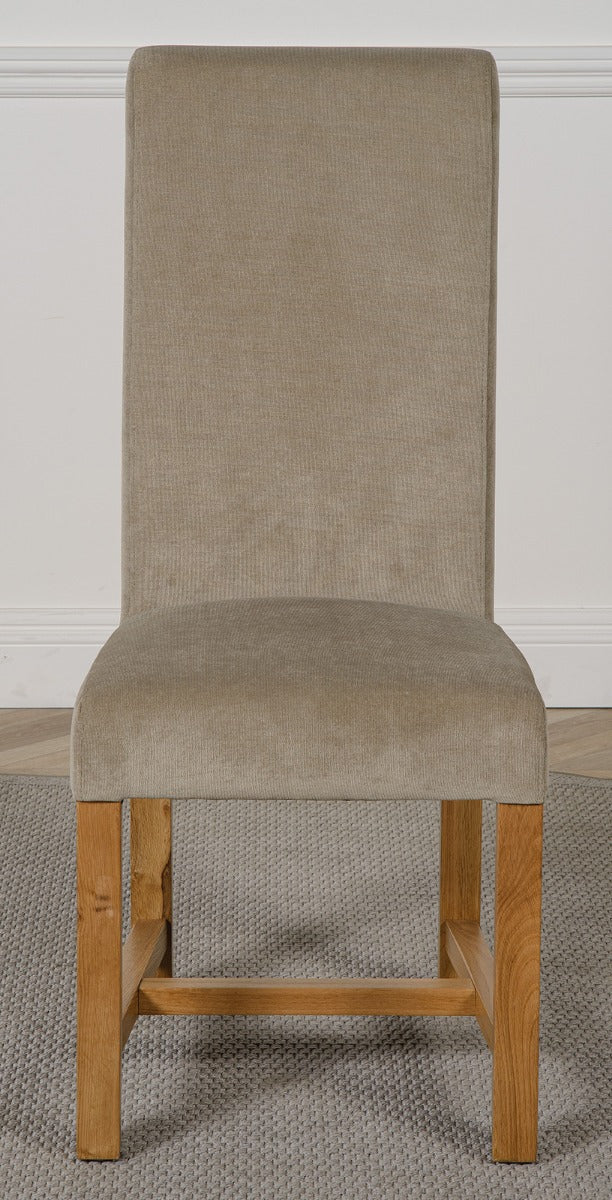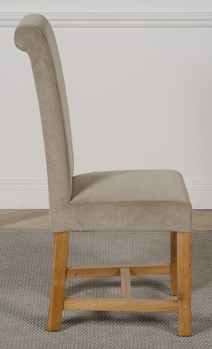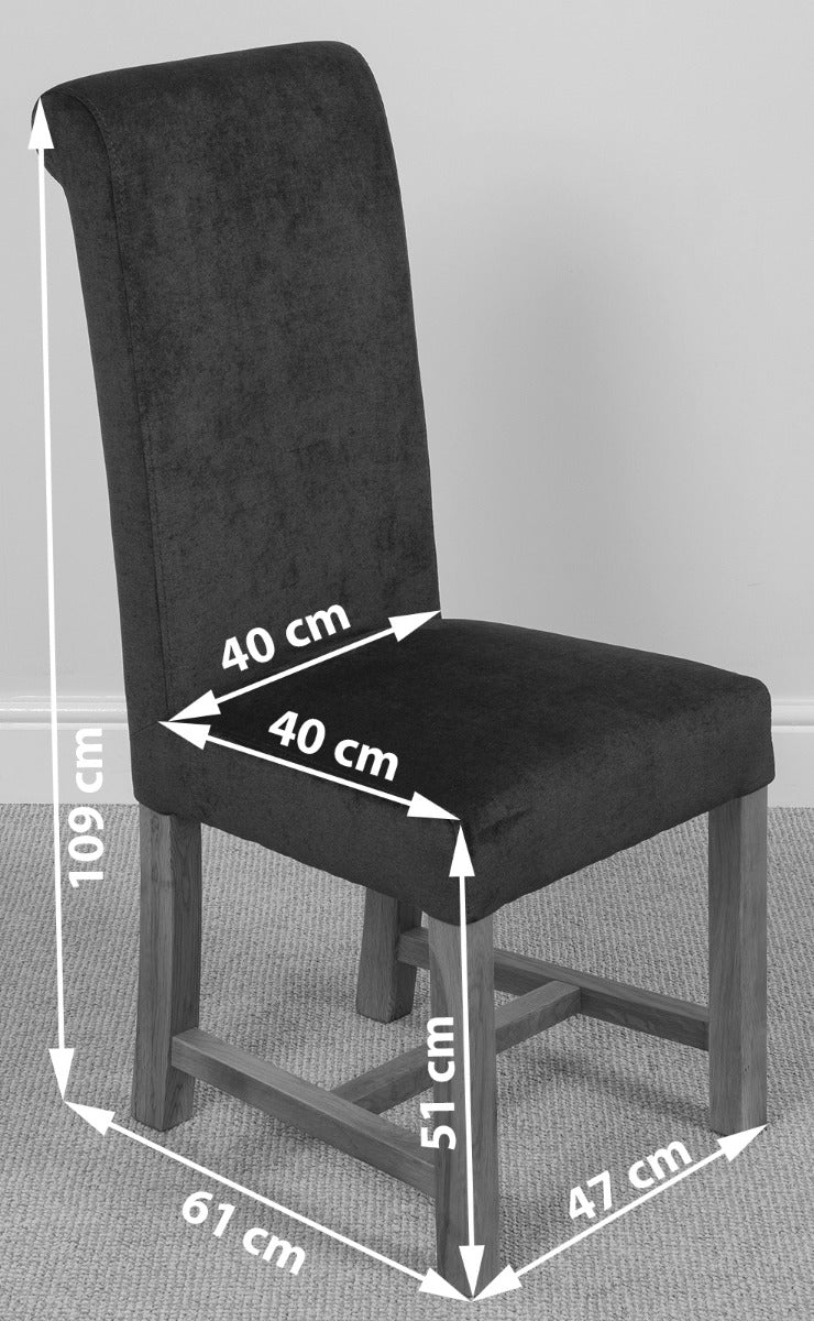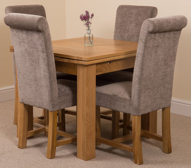 The Richmond square oak extending dining table comes complete with 4 luxurious Washington grey fabric dining chairs. Fully upholstered in grey fabric, the high back scroll top design gives the chairs a contemporary finish while braced solid oak legs and a solid hardwood frame provides strength and durability. The seats have spring-and-belt construction topped with medium density foam for the ultimate comfort.