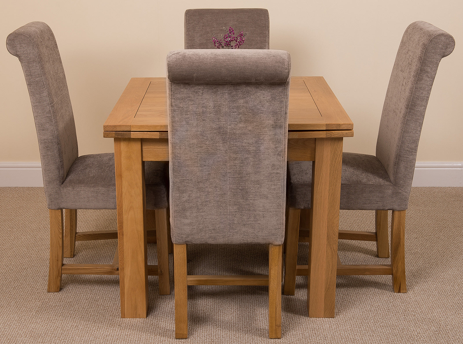 The Richmond oak kitchen table and 4 chairs delivers high quality workmanship in a compact oak dining set. Ideal for use in a kitchen diner or open plan living room, the Richmond oak wood table and chairs will add a touch of warmth to your home with its natural oak hue and sophisticated Washington grey velvet-like fabric chairs. A stylish and practical solution, this oak table and chairs offers spacious dining without taking up all of your precious space.