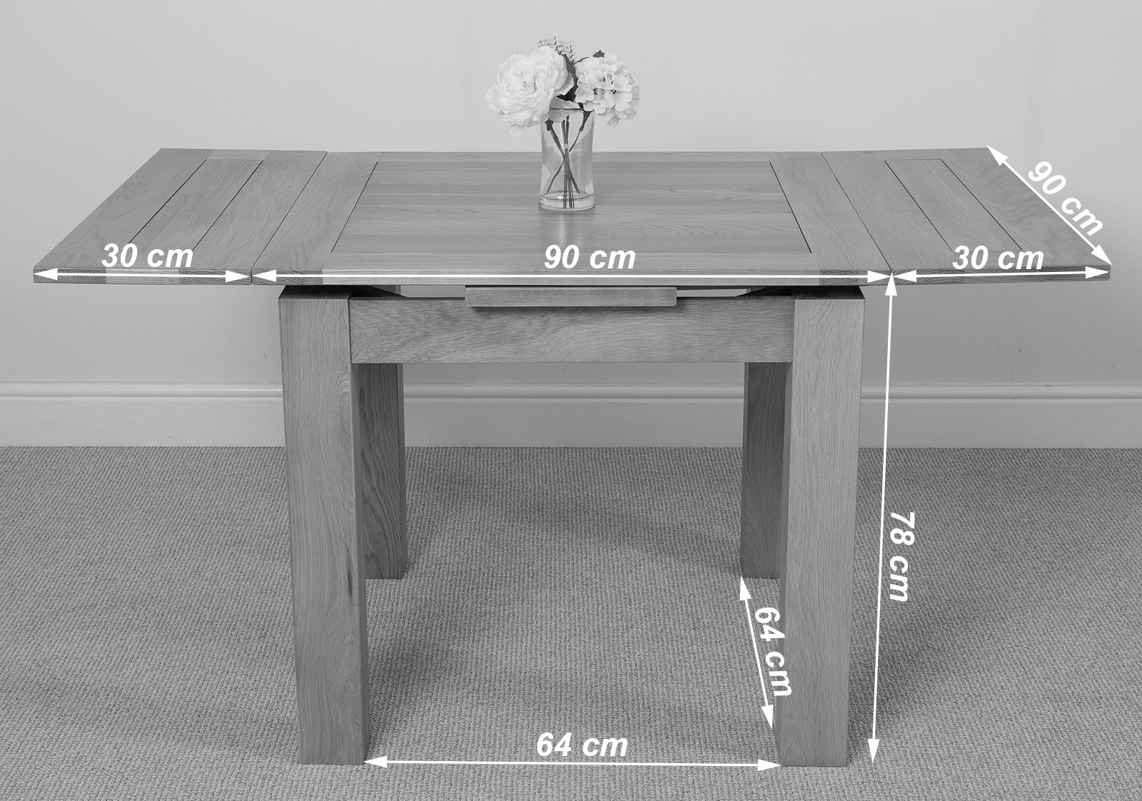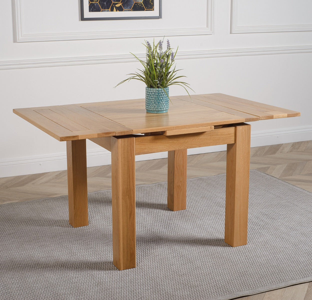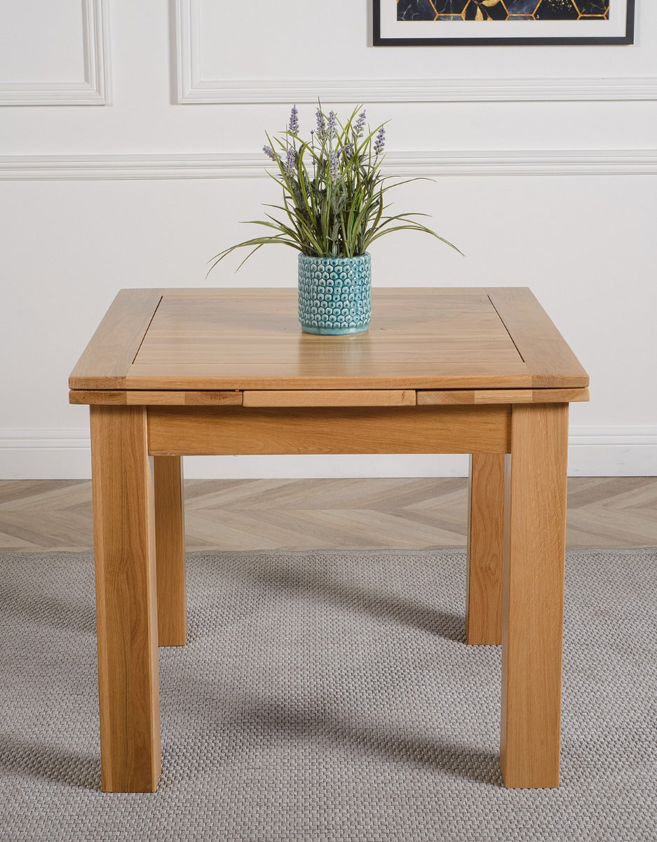 Ideal for accommodating last-minute meal time guests, this small oak dining table can seat up to 6 people when fully extended. Measuring 90 x 90cm as standard the Richmond oak dining table extends to a full length of 150cm using two 30cm extension panels at each end of the table. When not in use, the extension leaves store neatly under the table top. A protective coating of clear lacquer makes this oak dining set easy to clean with a damp cloth.