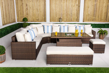 Santorini 6 Seat Rattan Sofa Set With Height Adjustable Drinks Cooler Coffee Table, Bench and Stool - Brown