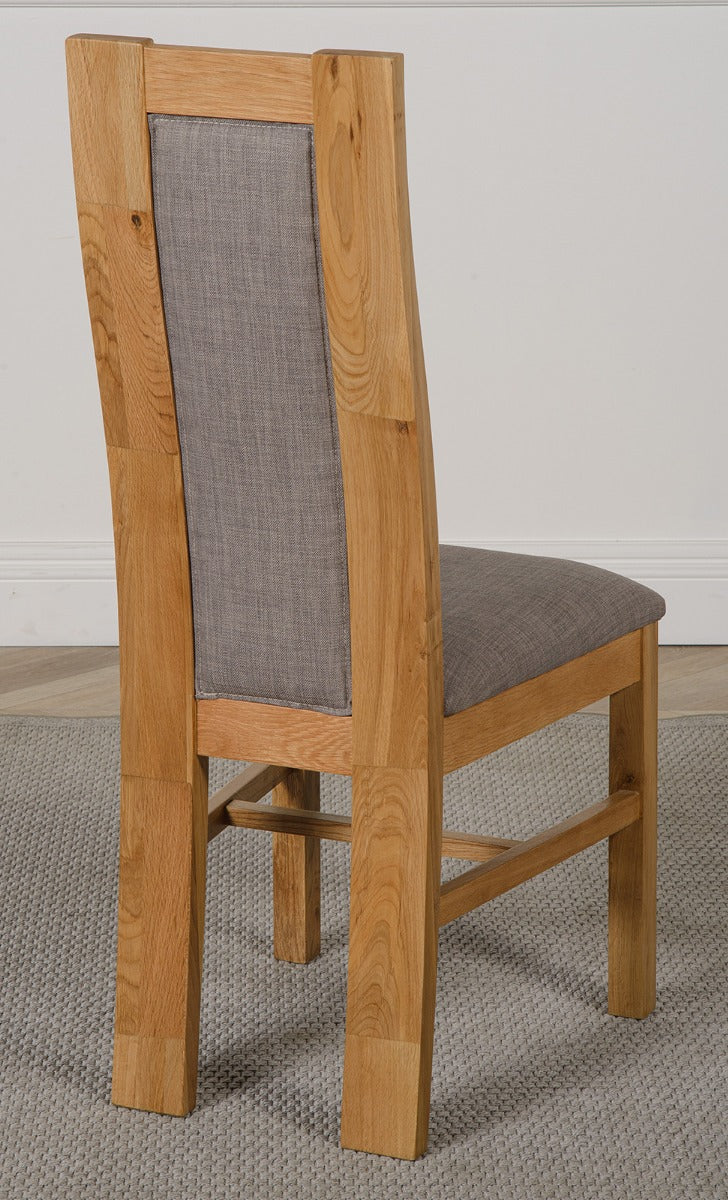 This contemporary wooden dining chair features a gently curved back design with an upholstered centre panel and seat pad in grey linen fabric. Timelessly stylish and robust the Stanford oak dining room chair will pair perfectly with any table to create a stylish and comfortable dining experience.