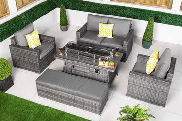 Sydney 2 Seat Rattan Sofa and Arm Chairs Set With Fire Pit Coffee Table & Bench - Grey