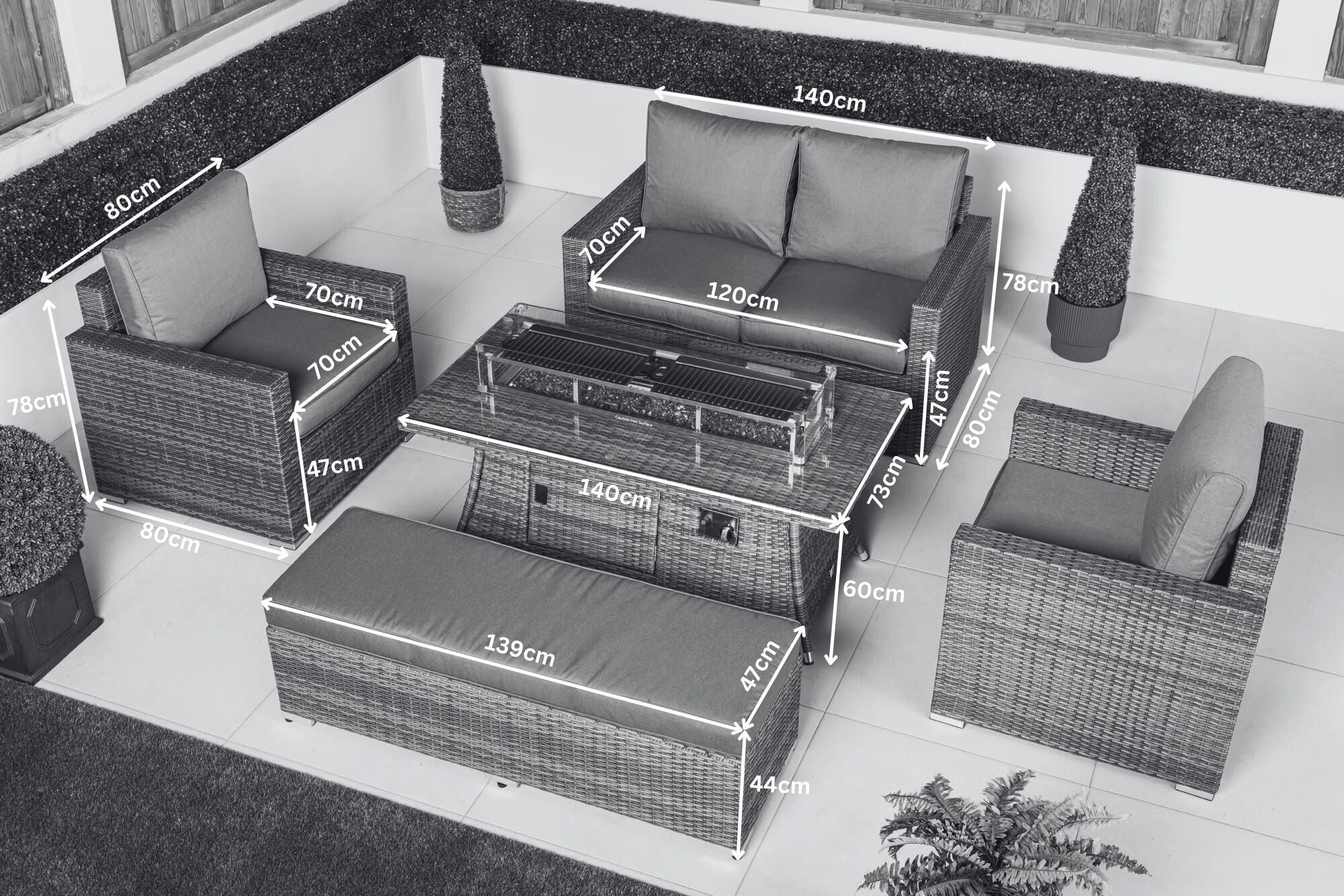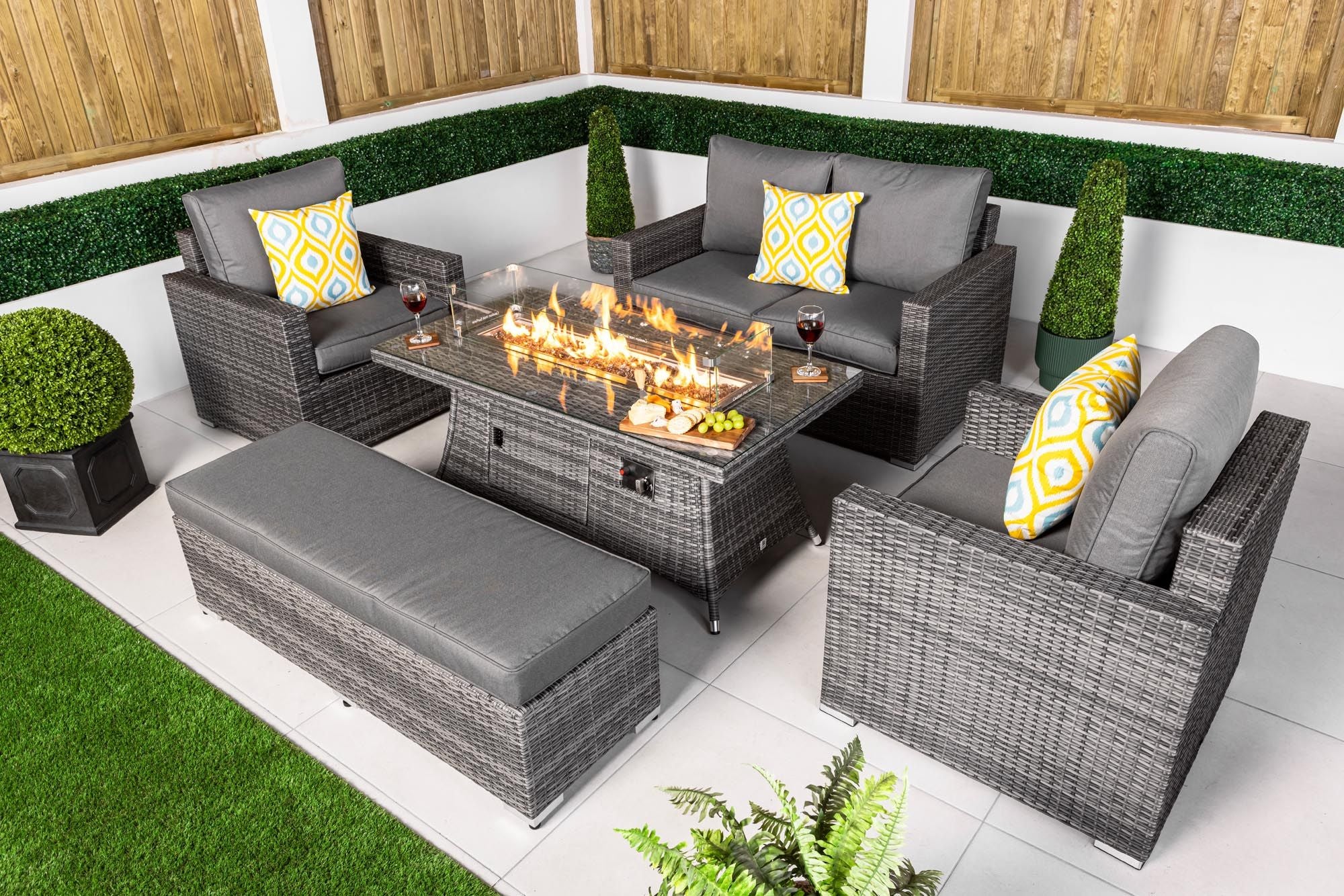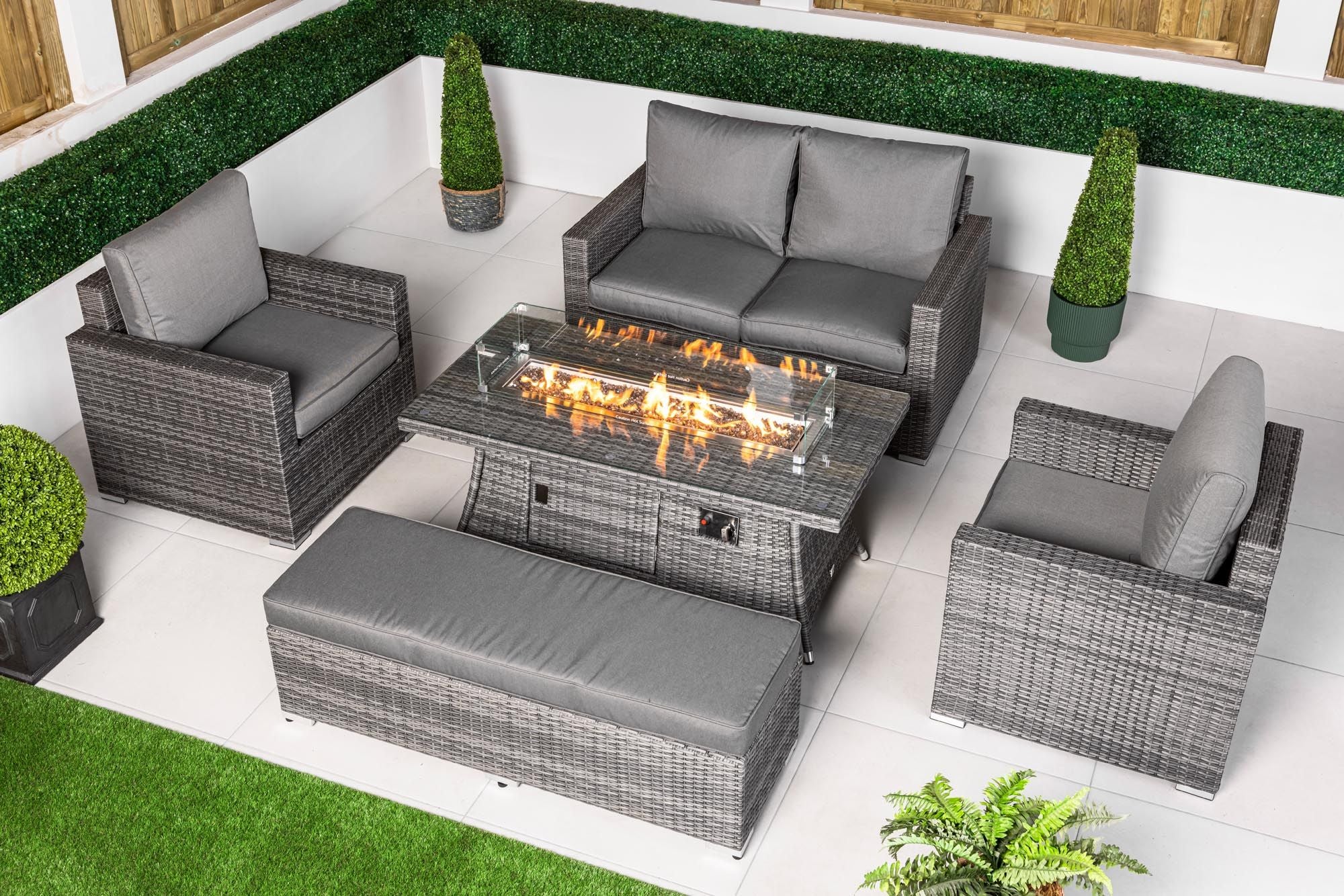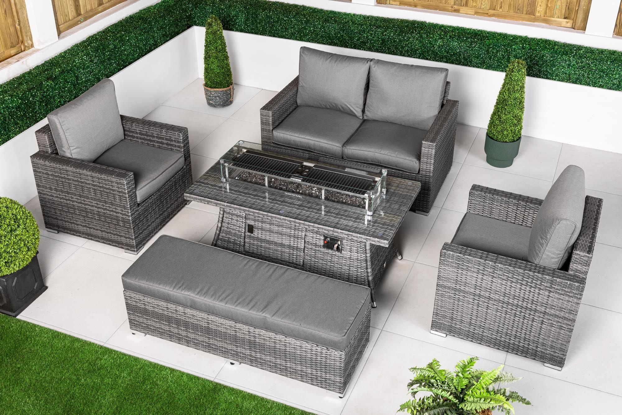 Designed for relaxed outdoor living and stylish entertaining, this luxury outdoor seating set creates a refined and welcoming space for modern gardens, patios and terraces. The set includes a fixed 2-seater sofa, two matching armchairs, a coordinating padded bench and a statement rectangular gas fire pit coffee table, offering generous seating and a balanced layout ideal for social gatherings and everyday outdoor relaxation.