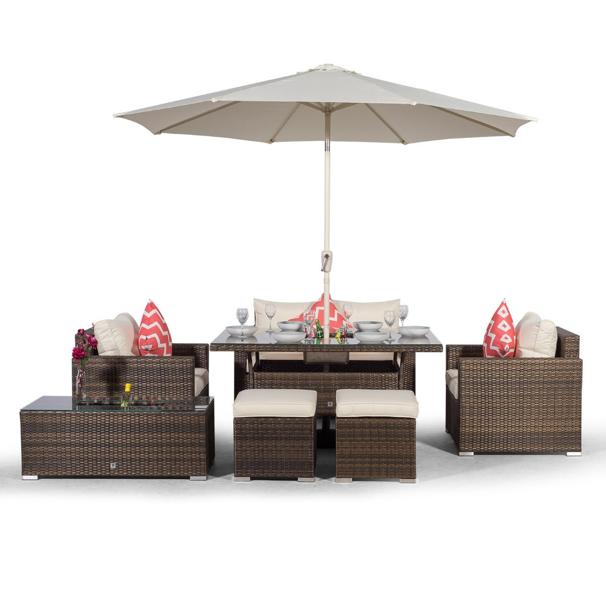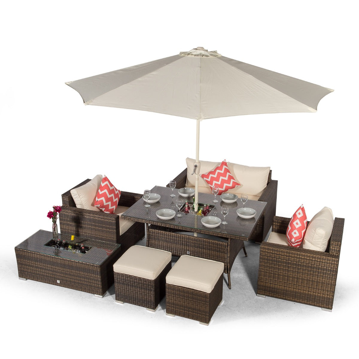 The dining table and coffee table both feature built in drinks coolers, providing the perfect setting for alfresco family meals. Simply fill with ice and enjoy chilled drinks all day long, great for hosting parties, barbeques and other outdoor events. The dining table comes complete with a 3m parasol and parasol base. The parasol features a wind-up 'crank' mechanism allowing it to easily fold away when not in use.