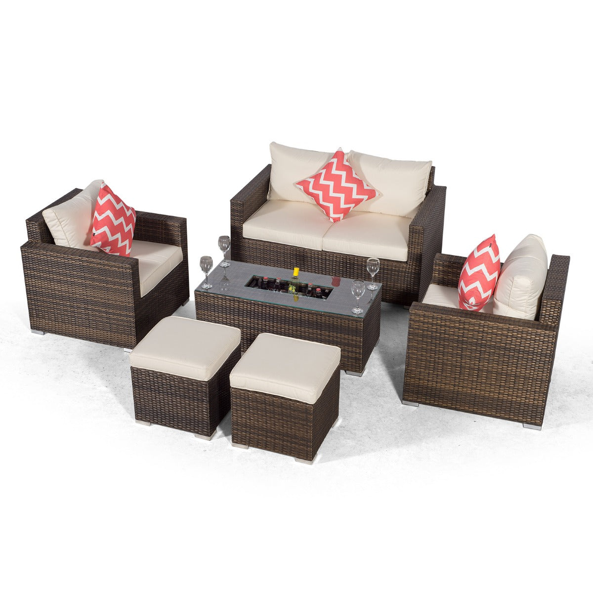 Sydney 6 Seater Drinks Cooler Conversation Dining Set With Coffee Table & 2 Stools - Brown