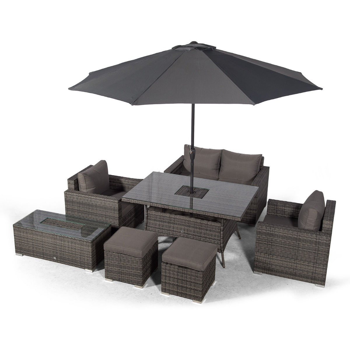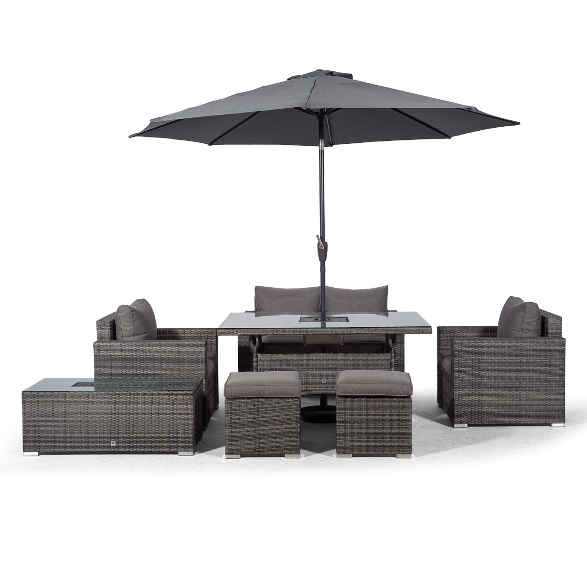 The dining table and coffee table both feature built in drinks coolers, providing the perfect setting for alfresco family meals. Simply fill with ice and enjoy chilled drinks all day long, great for hosting parties, barbeques and other outdoor events. The dining table comes complete with a 3m parasol and parasol base. The parasol features a wind-up 'crank' mechanism allowing it to easily fold away when not in use.