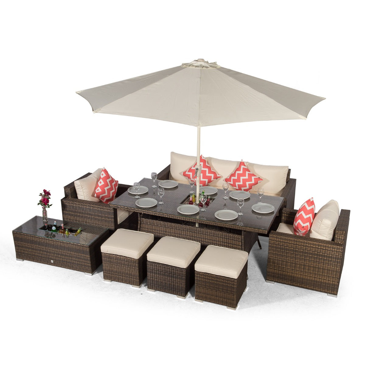 The dining table and coffee table both feature built in drinks coolers, providing the perfect setting for alfresco family meals. Simply fill with ice and enjoy chilled drinks all day long, great for hosting parties, and barbeques. The dining table comes complete with a 3m parasol and parasol base. The parasol features a wind-up 'crank' mechanism allowing it to easily fold away when not in use.