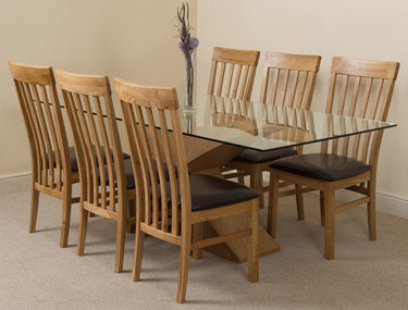 The Valencia large dining table and 6 chairs dining set is a stylish combination of glass and wood, crafted from 12mm thick tempered glass with a striking X shaped base made with real wood veneer finished in a natural oak colour. Combined with the comfortable Harvard oak chairs this versatile dining table set will be the focal point of any kitchen or dining room setting.