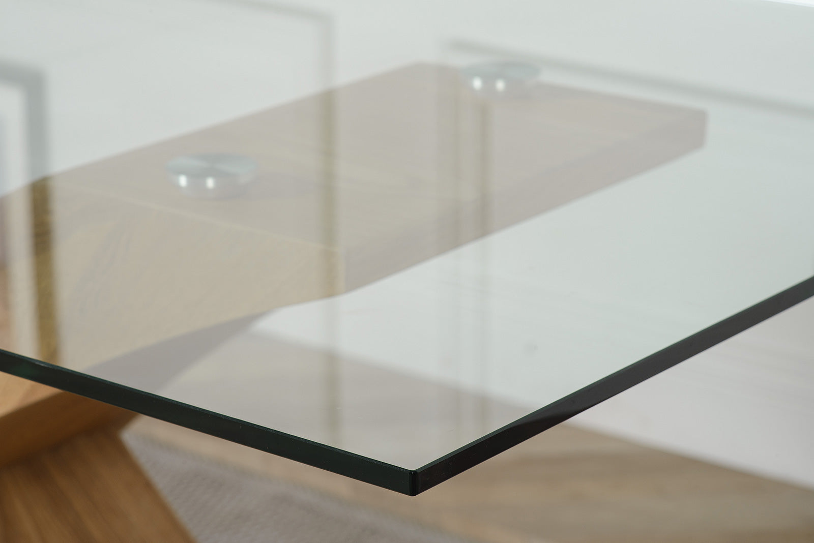 Made by skilled craftsmen, the Valencia table with chairs features a 12mm thick clear tempered glass top with bevelled edges allowing an unobstructed view of the stunning designer base. The base is made using real wood veneer finished in an oak wood hue.